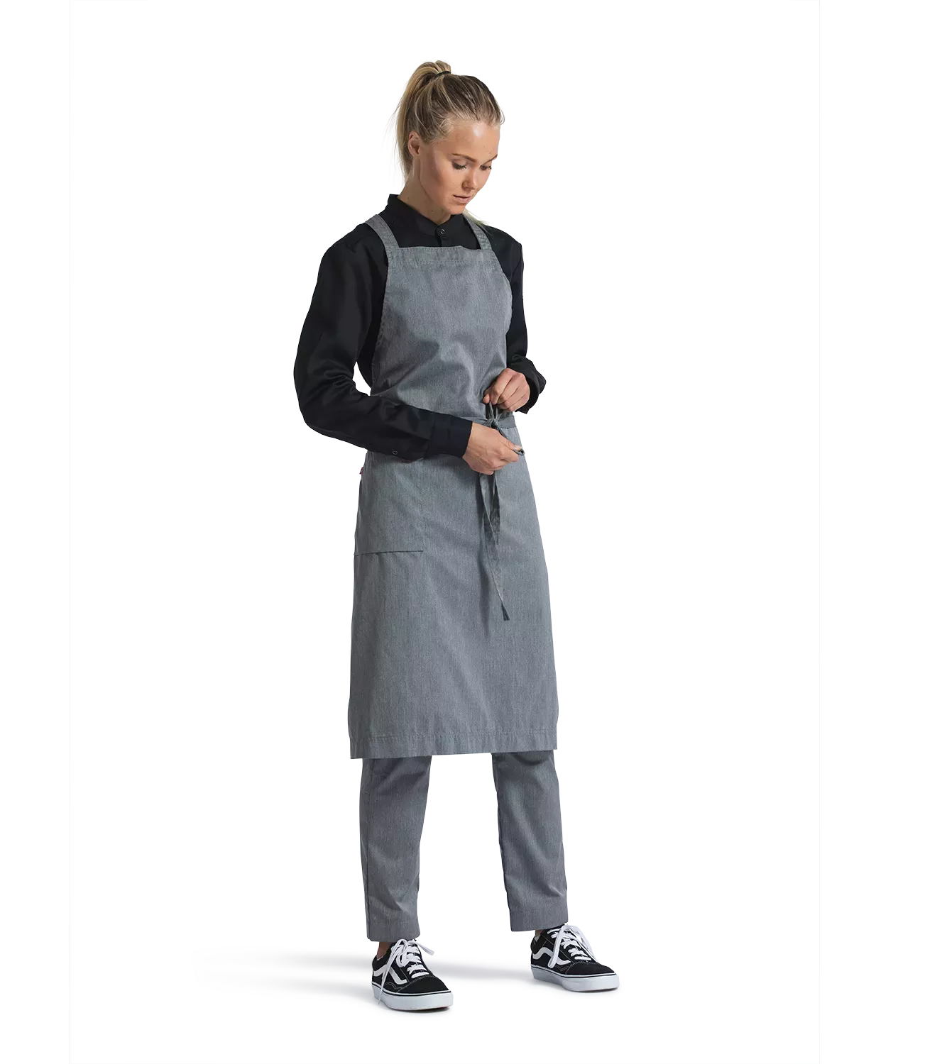 Первоклассный современный фартук с нагрудником. Довольно длинный — подол закрывает колени. Размер полотна: примерно 70 х 100 сантиметров. Свободные поясные ремни легко завязываются на талии. Бретели перекрещиваются на спине — такая конструкция особенно удобна при длительном ношении, поскольку снимает нагрузку с плеч. Дополнительные петлицы позволяют гибко регулировать длину бретелей под ваш рост и объём грудной клетки. С правой стороны расположен вместительный карман с держателем для ключа и флажком-логотипом.