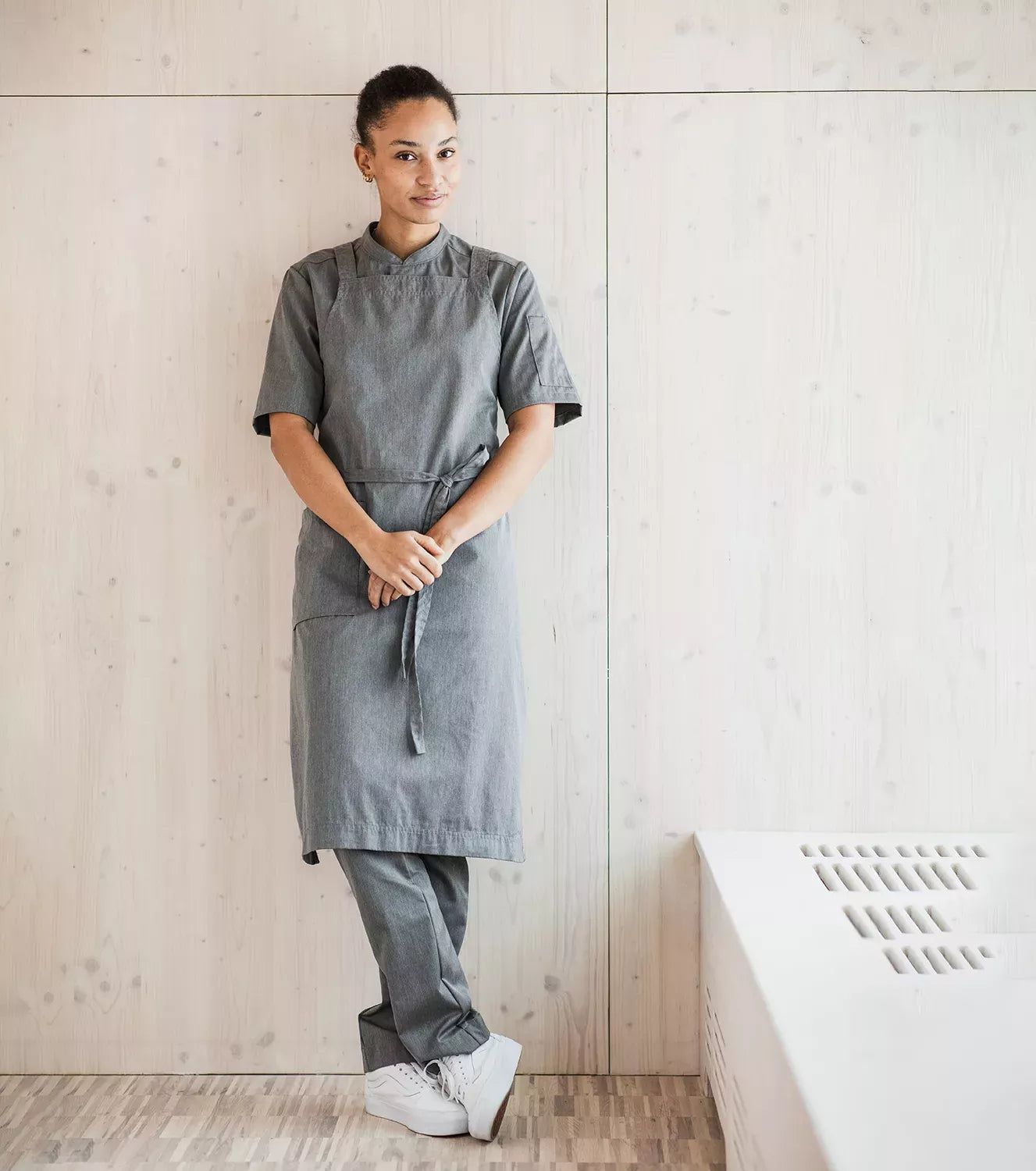 Выполнен из лёгкой и плотной саржи (50% переработанный полиэстер / 50% хлопок) – 180 г/м². Материал обладает высокой прочностью, устойчив к деформации. Мягкий на ощупь. Отличается приятным шелковистым блеском. Ткань изготовлена с учётом строгих европейских эко-стандартов, не вызывает аллергии и безопасна в условиях работы с пищевыми продуктами.