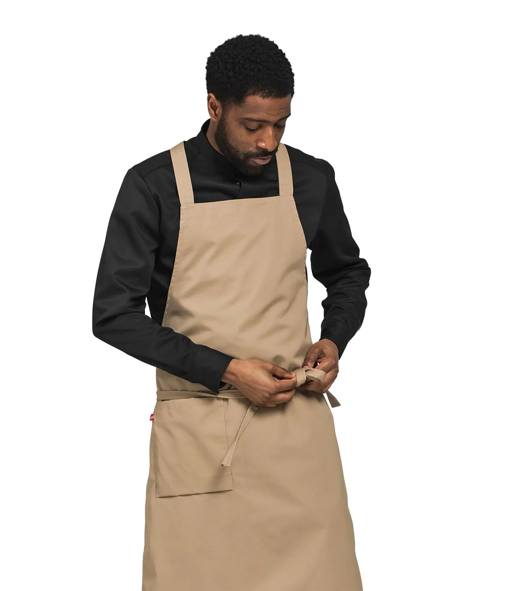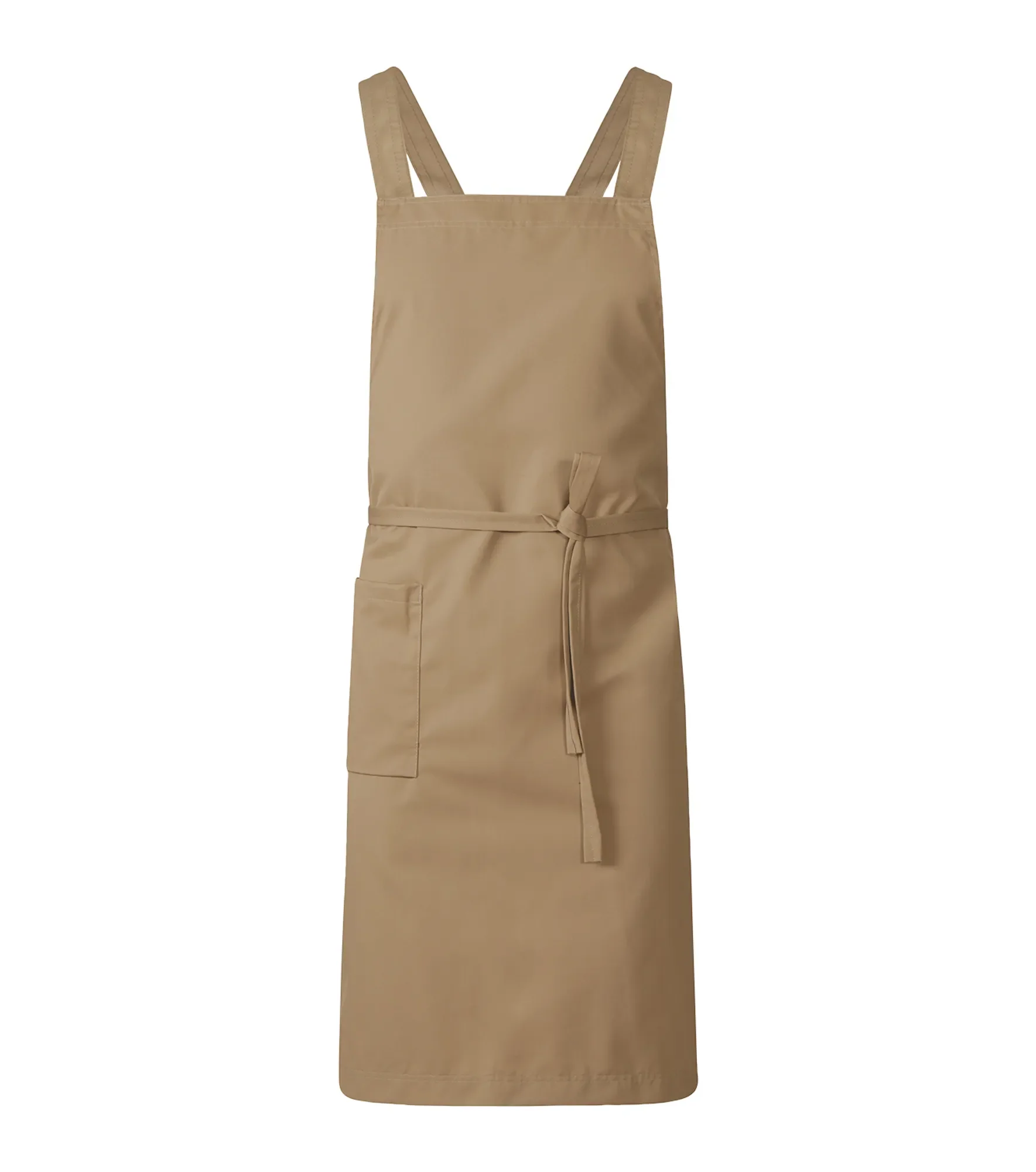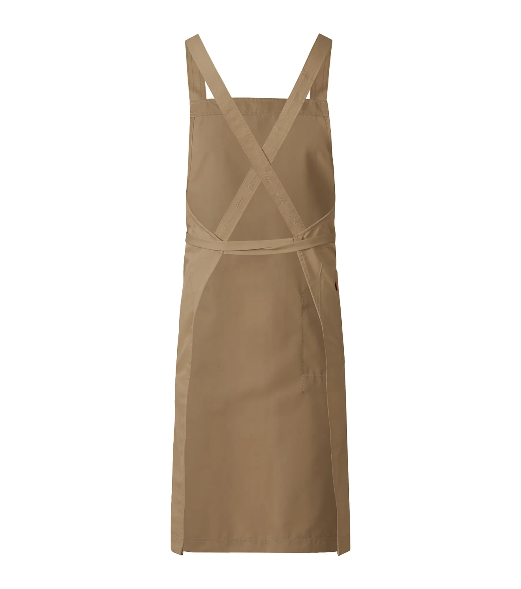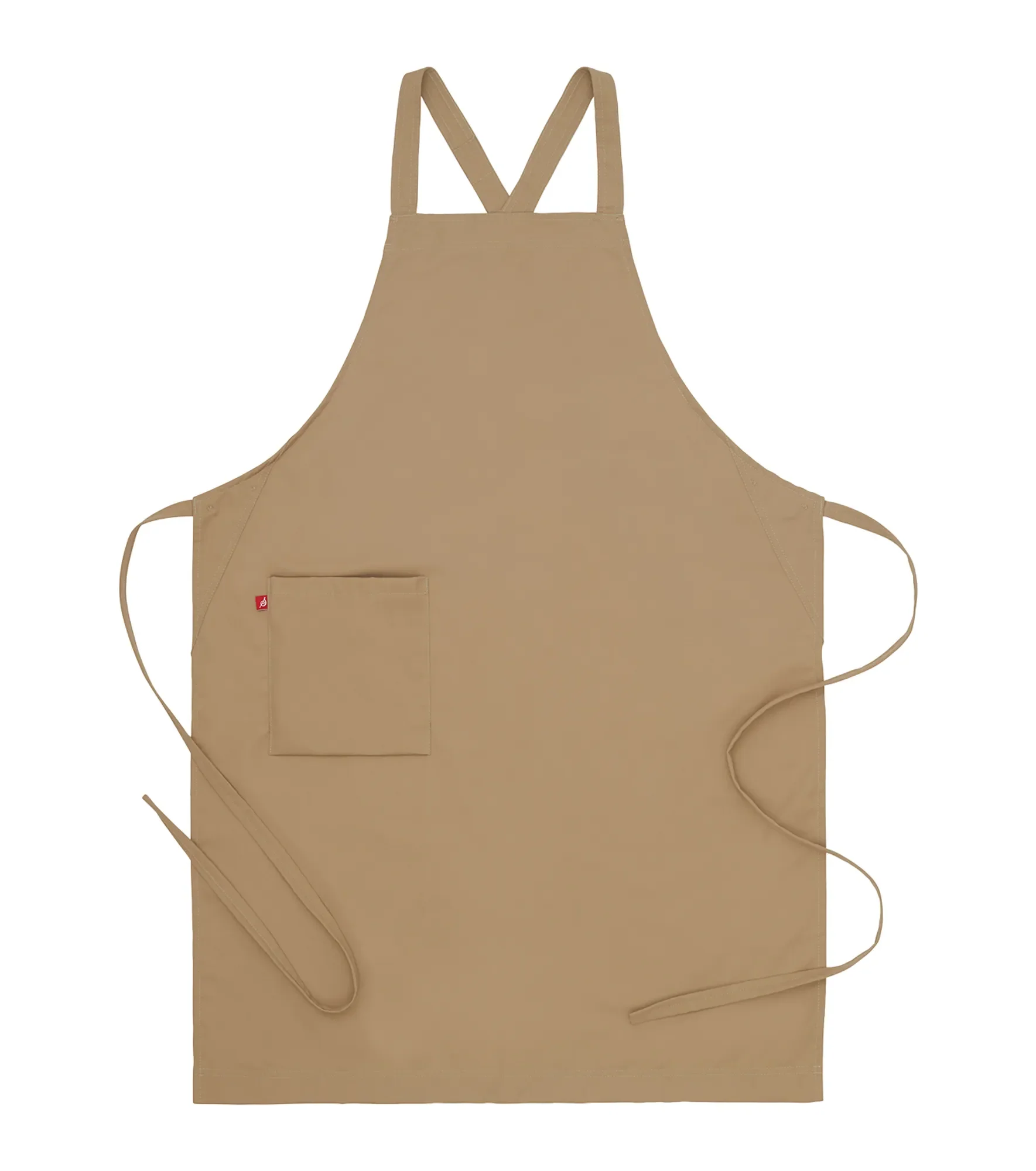 Первоклассный современный фартук с нагрудником. Довольно длинный — подол закрывает колени. Размер полотна: примерно 70 х 100 сантиметров. Свободные поясные ремни легко завязываются на талии. Бретели перекрещиваются на спине — такая конструкция особенно удобна при длительном ношении, поскольку снимает нагрузку с плеч. Дополнительные петлицы позволяют гибко регулировать длину бретелей под ваш рост и объём грудной клетки. С правой стороны расположен вместительный карман с держателем для ключа и флажком-логотипом.
