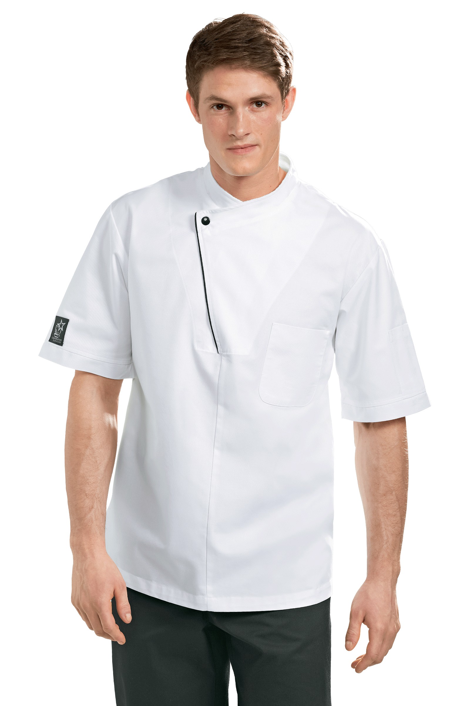 Лёгкий поварской жакет прямого силуэта с воротом-стойкой. Надевается через голову, а горловина застёгивается на клапан со стильной чёрной окантовкой. Изнутри ворот подшит мягкой махровой тканью, а подмышками расположены вентиляционные отверстия. На левом плече есть карман для ручки и градусника с двумя отделениями. Спинка очень комфортна благодаря широкой бантовой складке.