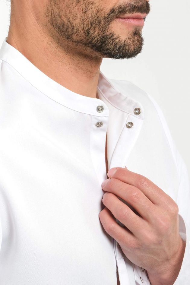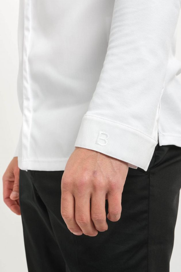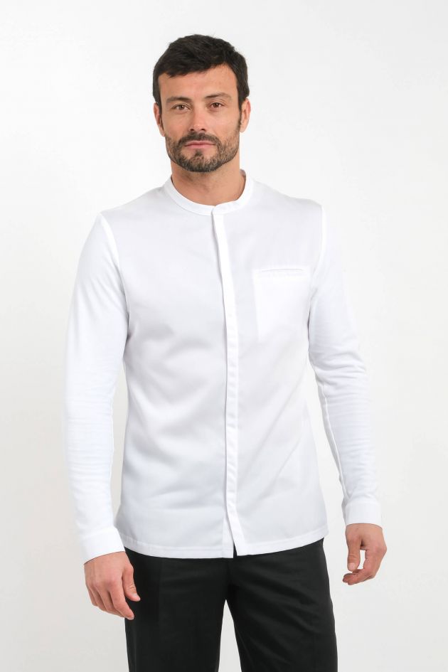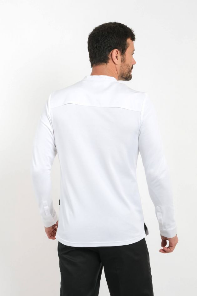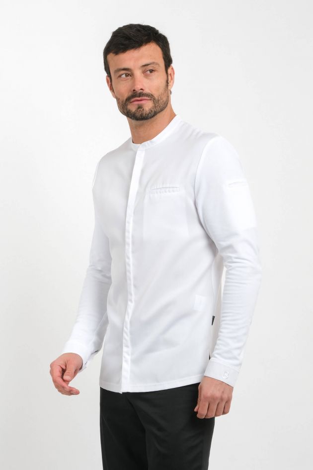 Строгий приталенный жакет шеф-повара с низким воротом-стойкой и длинным рукавом. Застёжка спереди, кнопки скрыты под планкой. Слева расположен нагрудный карман в рамку, а на левом рукаве - кармашек для ручки или градусника. ITHURRIA - очень лёгкая и комфортная модель. Рукава и спинка выполнены из натуральной дышащей материи. Сзади под кокеткой есть горизонтальные прорези, которые обеспечивают дополнительную прохладу и свежесть даже в самые жаркие дни.