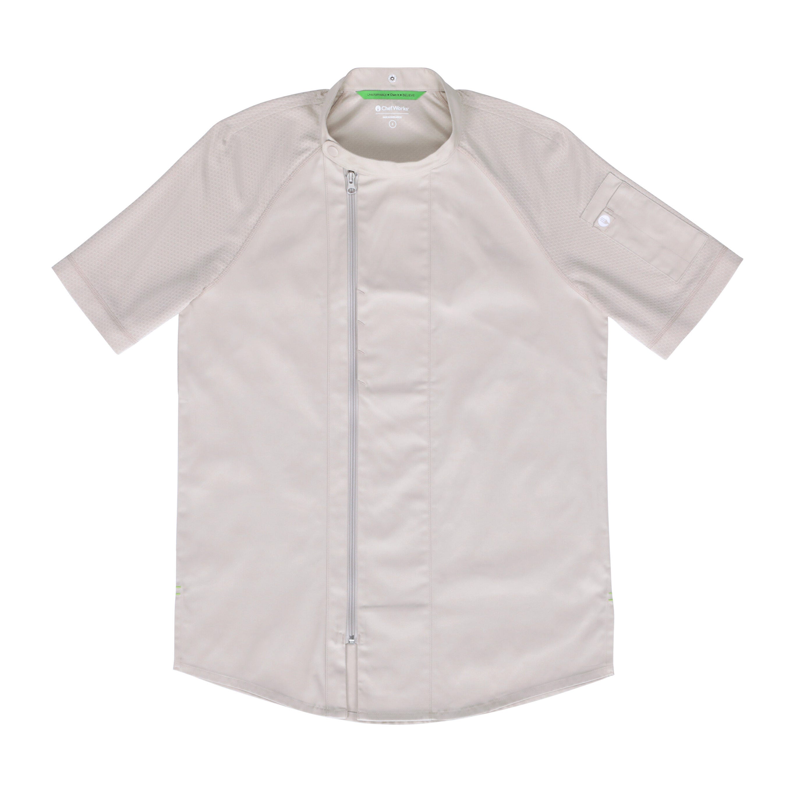 Почувствуйте обновляющий прилив бодрости и вдохновения вместе с нашим новым кителем шеф-повара «Варкала». Это современный жакет с коротким рукавом, свободным воротником-стойкой и застёжкой на «молнии», смещённой вправо. Обратите внимание, как необычно оформлен нагрудный карман – его вход расположен возле застёжки, под правую руку, и почти не заметен. На спинке под воротом есть пата для фиксации бретели фартука. Кармашек для термометра на левом рукаве украшен нашивкой с логотипом бренда. Подол округлый, как у итальянской рубашки, с вентиляционными разрезами по бокам. Петелька на внутренней стороне ворота содержит оригинальную вдохновляющую цитату. Начните свой рабочий день с напутствия одного из великих поваров!