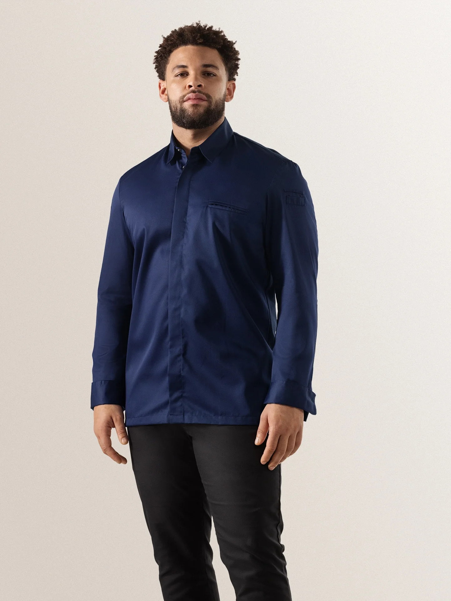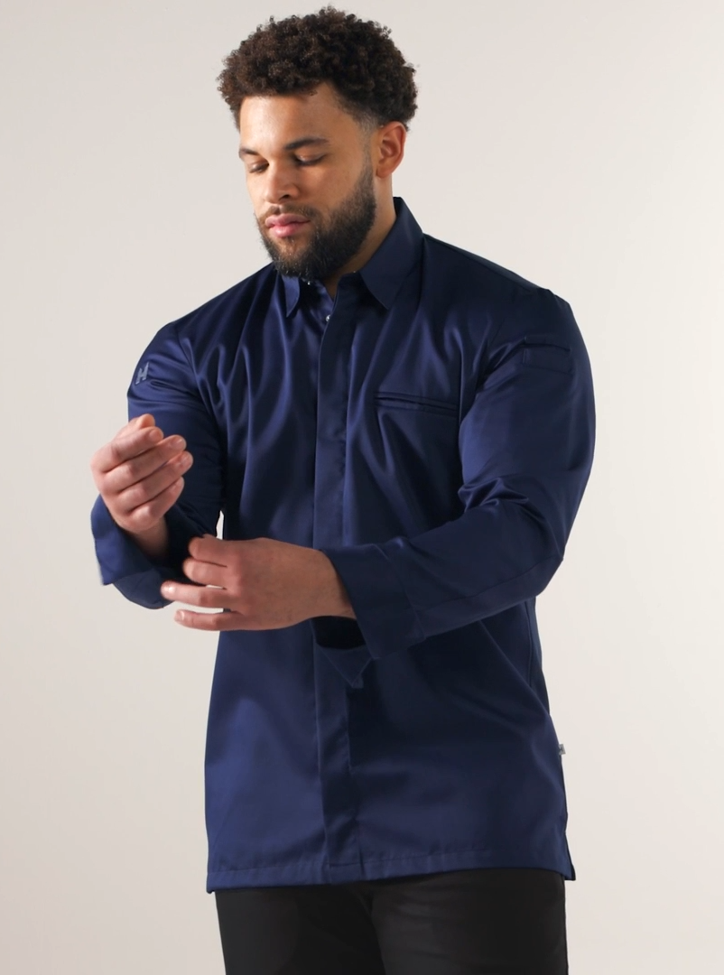 Дизайн жакета имитирует популярный фасон рубашки полуприлегающего кроя, с элегантными полуприлегающими рукавами, завершенными манжетами с отворотами. Нижние срезы немного закруглены. Модель имеет оформленный листочкой нагрудный карман и кармашек для карандаша на левом рукаве.