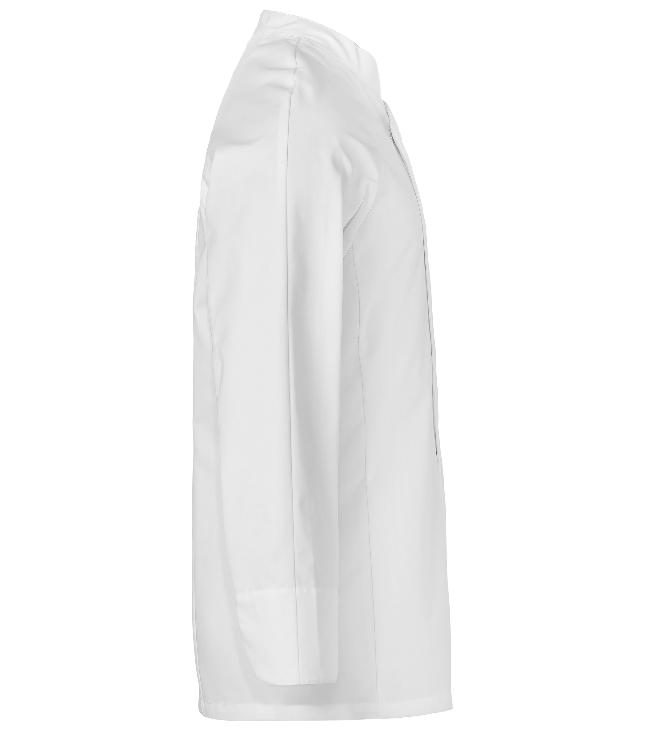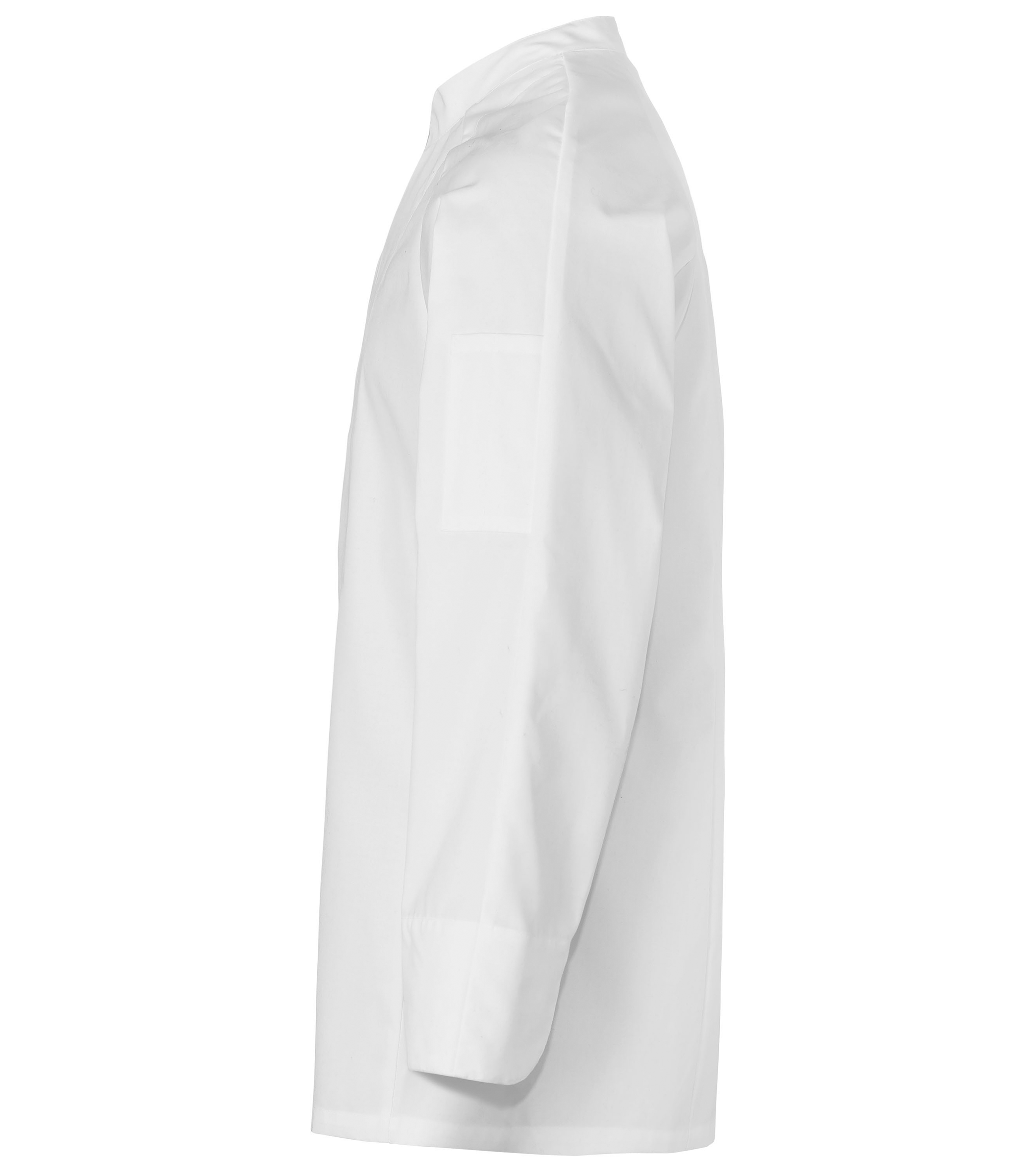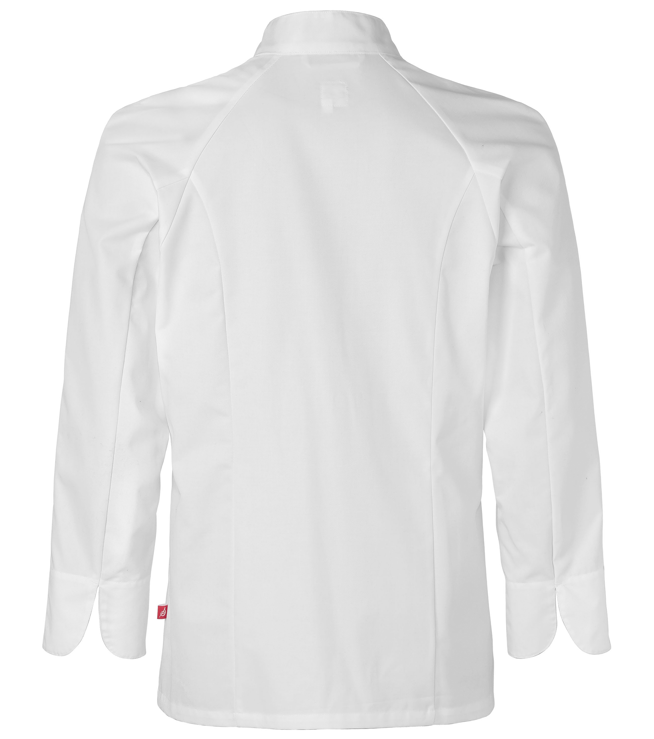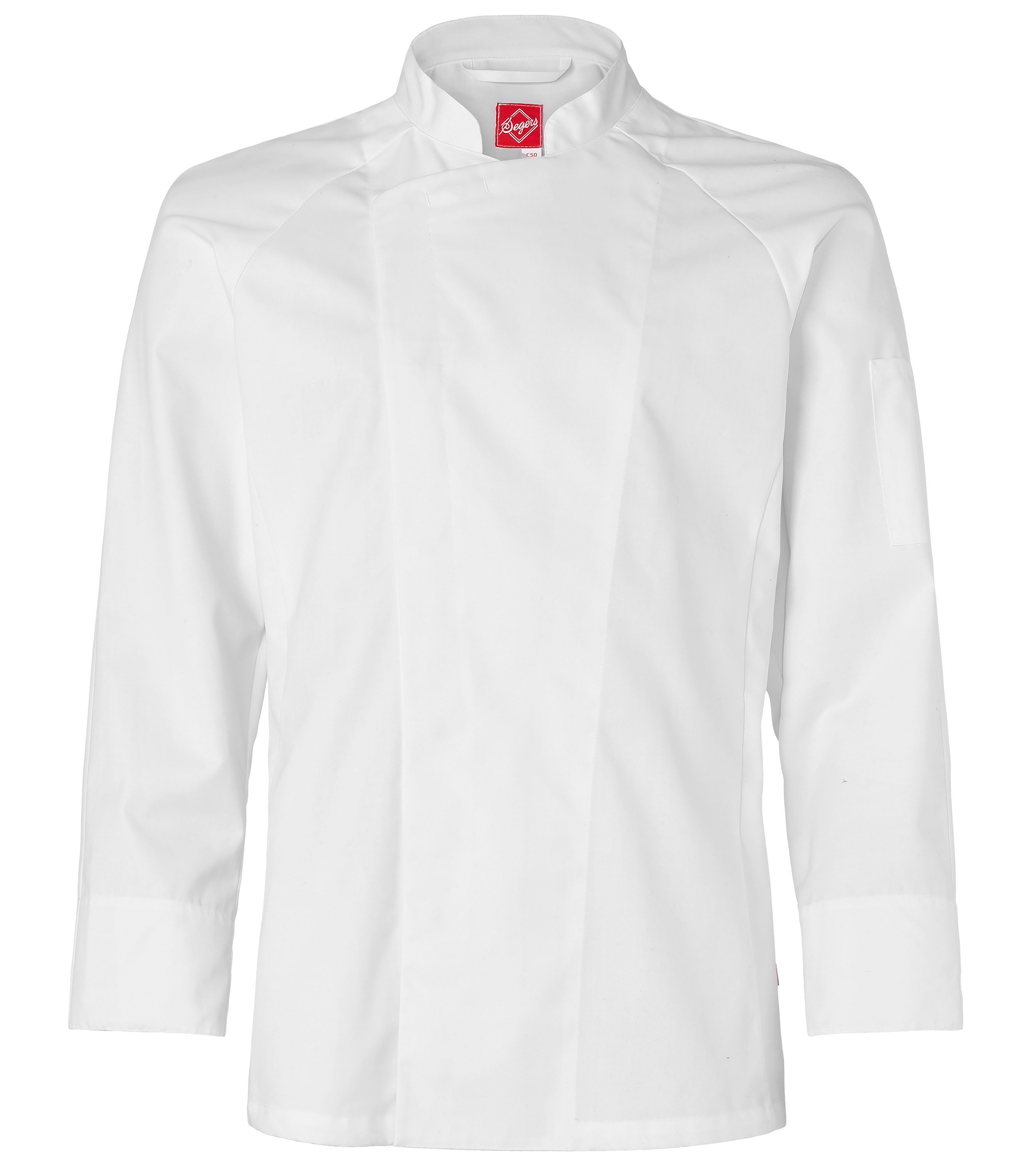 Двубортный поварской китель с длинным рукавом. Модель построена по современным лекалам. Её характеризуют такие особенности как: вертикальные швы на спинке, подчёркивающие силуэт, свободный рукав-реглан и привычный для поварской униформы жёсткий воротничок-стойка. Рукава оформлены манжетами с фигурным вырезом. На левом плече находится кармашек для авторучек. Подол прямой. Жакет застёгивается на потайные кнопки. На обратной стороне ворота есть воздушная петля усиленная нейлоновой нитью. Там же расположена ярко-красная нашивка с логотипом бренда.