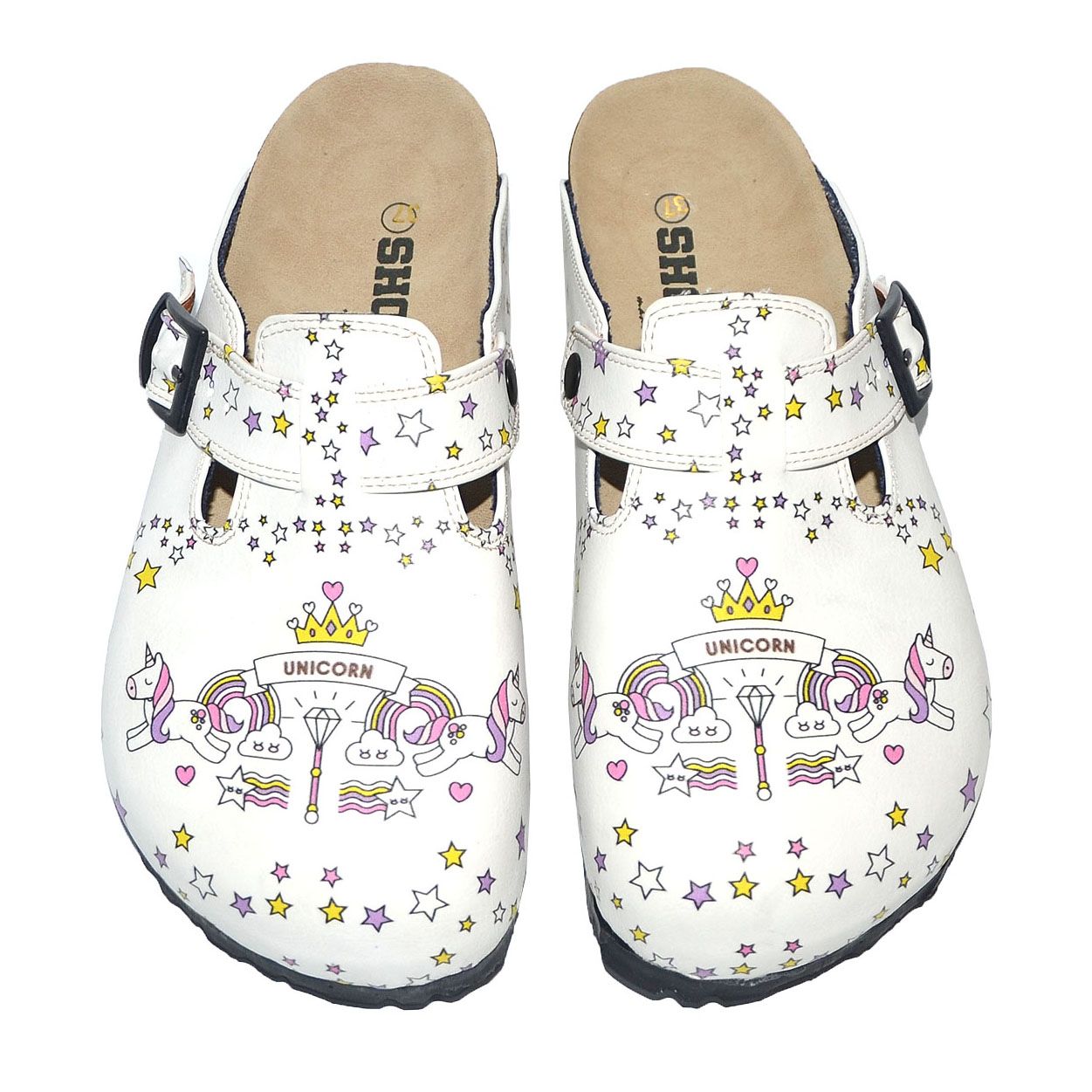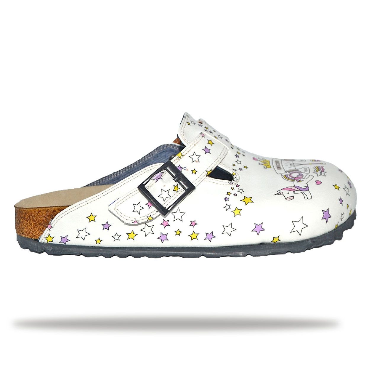Сабо с анатомической стелькой для повара, бармена или официантки. Подошва не скользит, металлическая застежка позволяет регулировать полноту. У данной модели веселый детский рисунок на белом фоне: единороги, звездочки, сердечки, радуга.