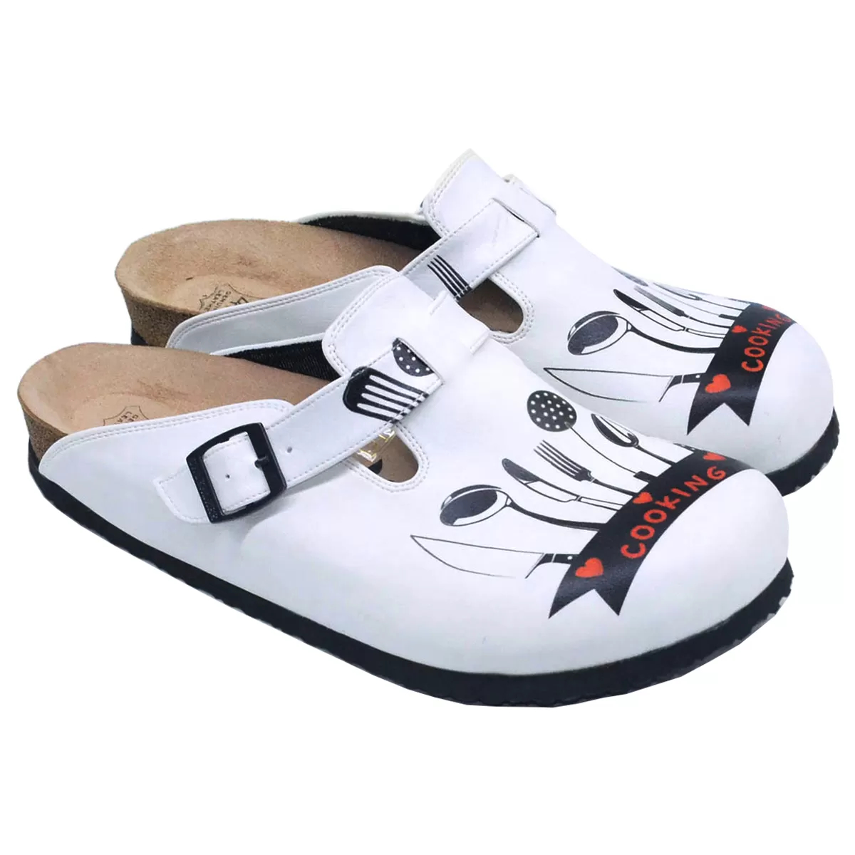 Перед вами новые сабо для поваров от известного турецкого бренда ShoeRokee. Верх выполнен из белой искусственной кожи* и украшен эксклюзивным рисунком (эта модель выпущена специально для наших покупателей!) на тему кухни. Подошва – высокотехнологичный полиуретан со сниженным коэффициентом скольжения. 5-и точечная массажная стелька улучшает кровообращение стопы, а невысокий амортизирующий каблук помогает правильно распределить нагрузку при ходьбе. Ремешок с пряжкой позволяет регулировать плотность посадки сабо в области подъёма.