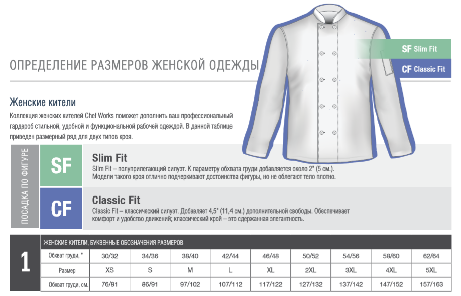 Если вы всё же хотите сами разобраться в системе определения размера поварской одежды Chef Works, ниже мы приводим таблицы для разных групп мужской и женской одежды с подробным описанием.