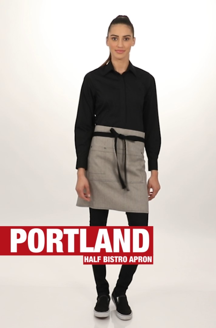 Portland – модель, построенная на контрастах. Черно-белое или сине-белое полотно фартука оттеняется черной или синей лентой пояса и светлой акцентной отстрочкой деталей. Обеспечивающая прочность закрепочная строчка служит одновременно и декоративным элементом. Тонкие вертикальные полосы полотна зрительно удлиняют силуэт, делая его более стройным.