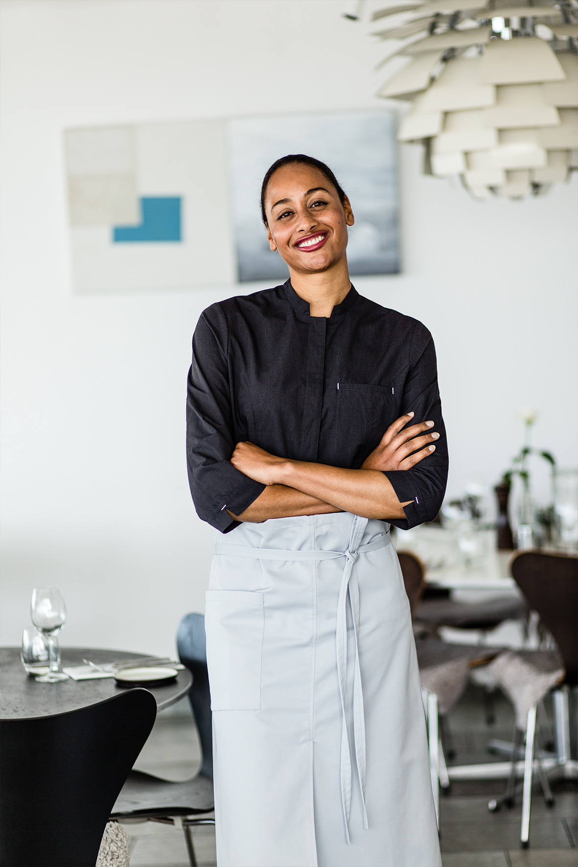 Современный и стильный поясной фартук. Широкое полотно полностью закрывает колени, удобные пояски можно обернуть вокруг талии. Благодаря разрезу в центре подола, модель будет особенно удобна для официантов. Справа расположен карман со складочкой и держателем для ключей. На внутренней стороне есть петля, за которую фартук можно подвесить на одёжный крючок.