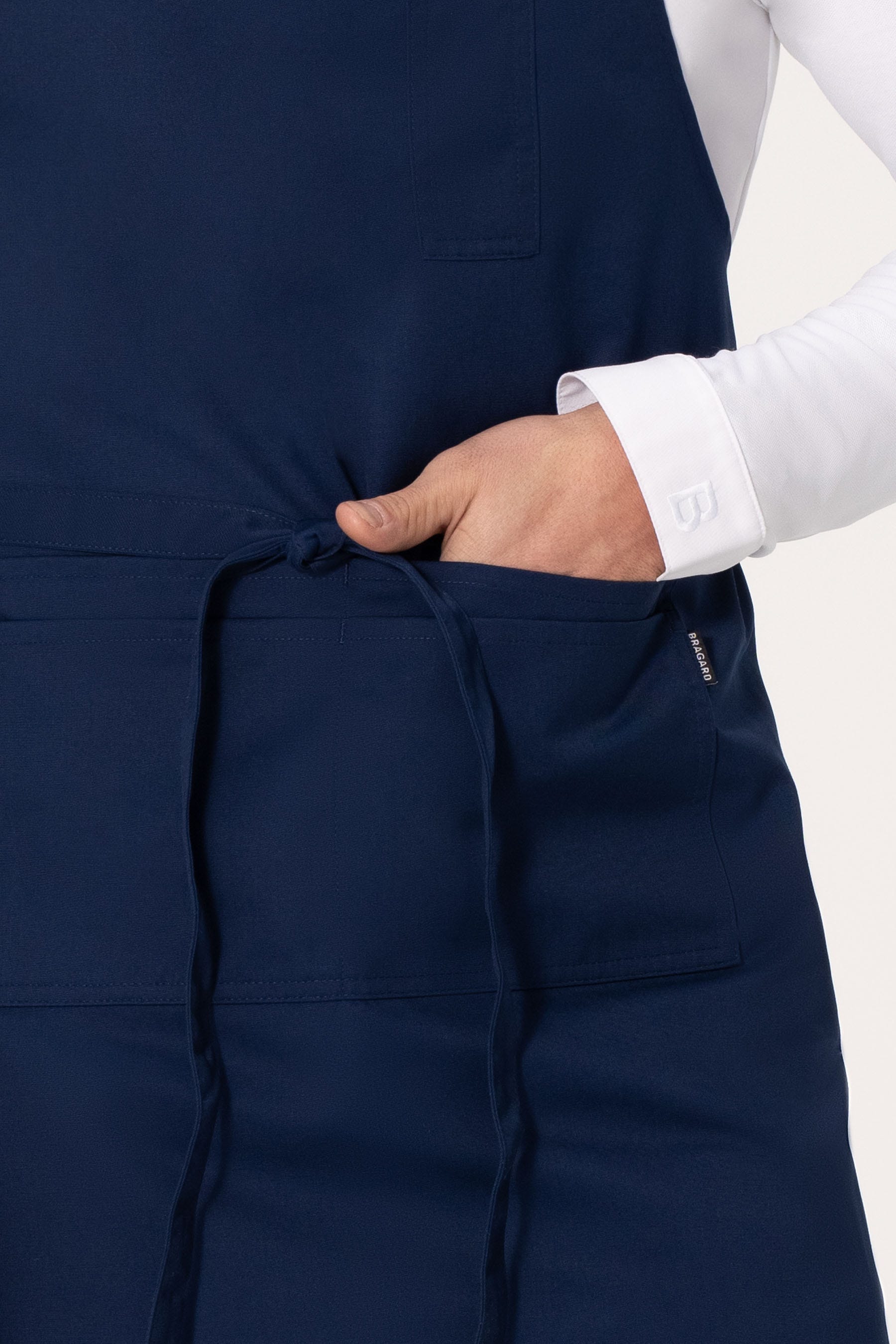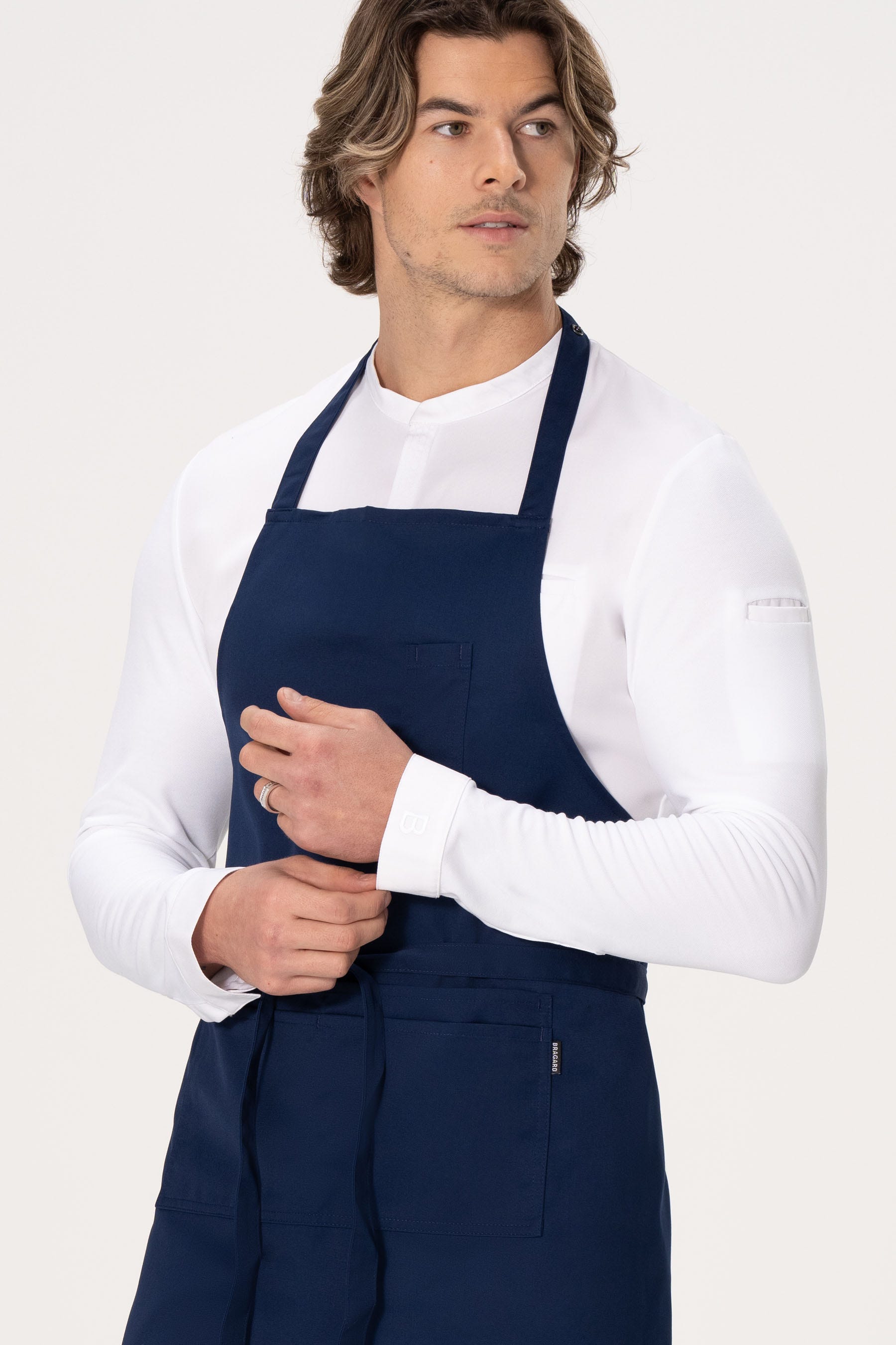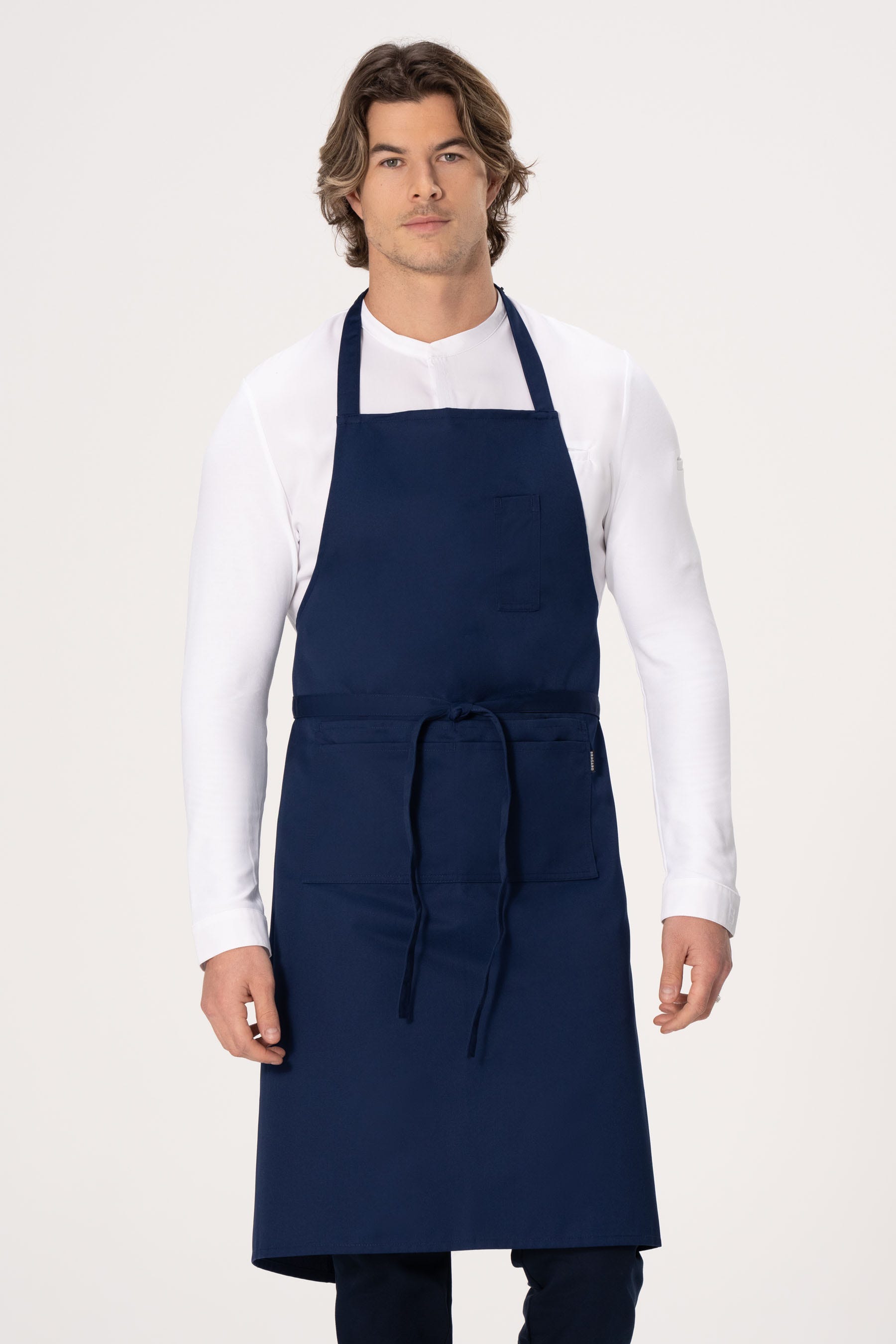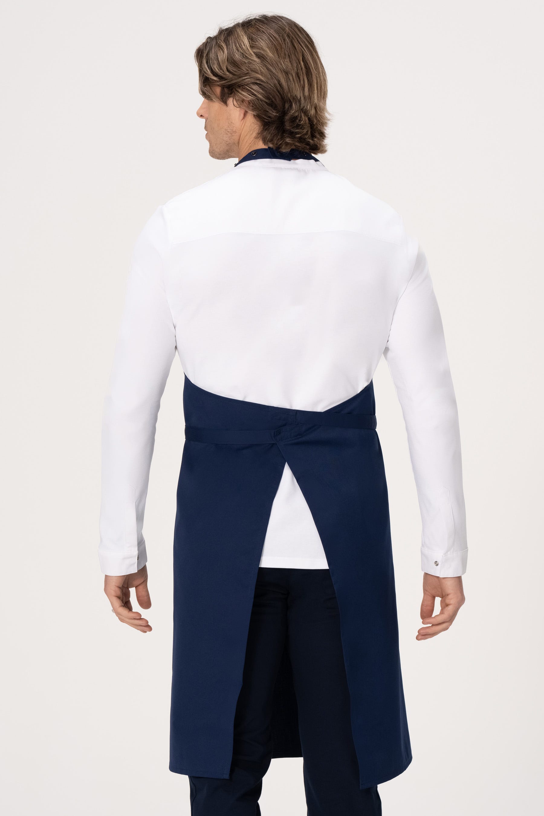 Перед вами классический длинный фартук для сотрудников зала: официантов, барменов, хостесс. Полотно закрывает колени, бретель-петля регулируется сзади при помощи трёх металлических кнопок. Спереди расположены широкие двойные карманы, а с левой стороны нагрудника - узкий кармашек для авторучки. Длинные завязки пояса можно обвязать вокруг талии или заложить в красивый бант.
