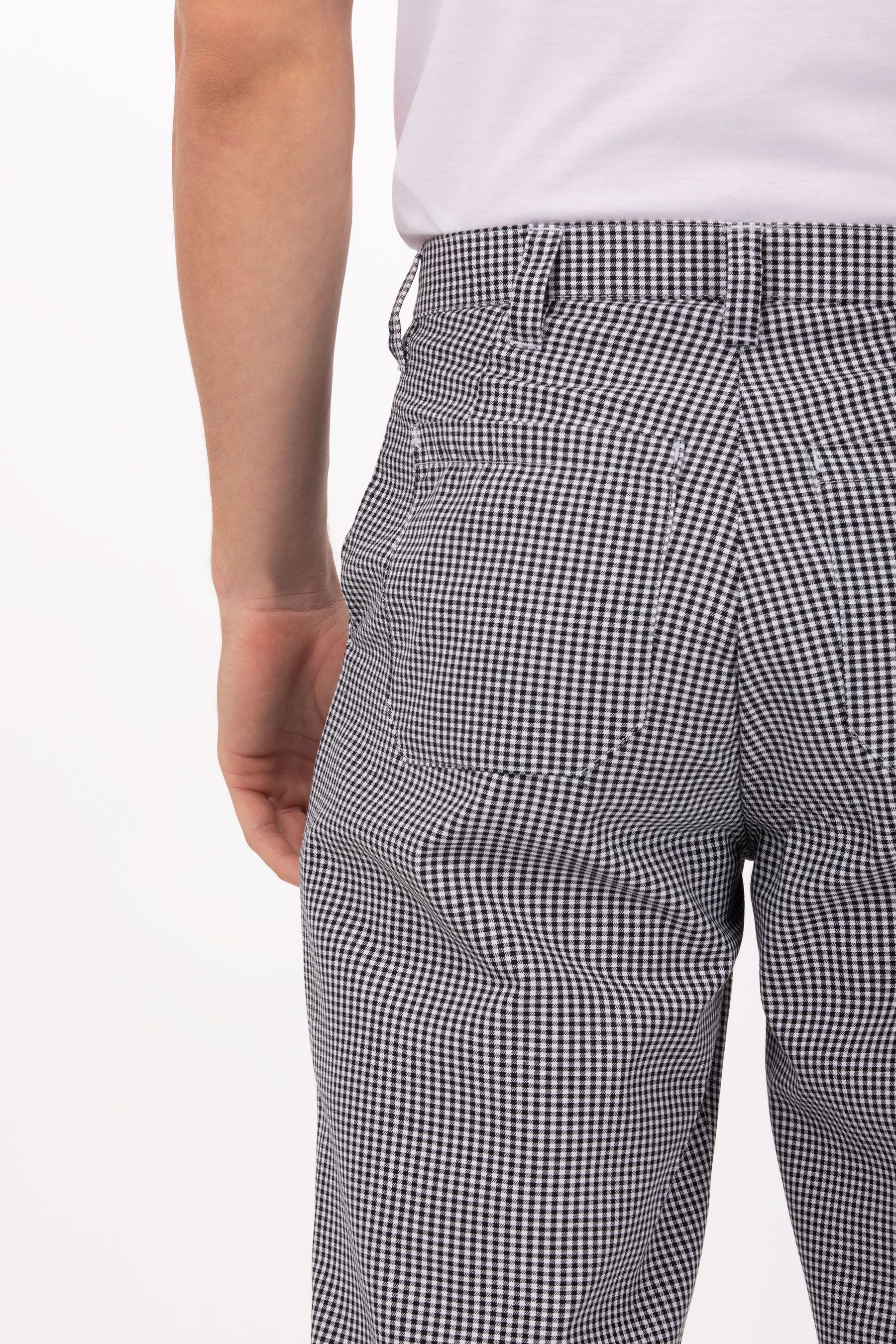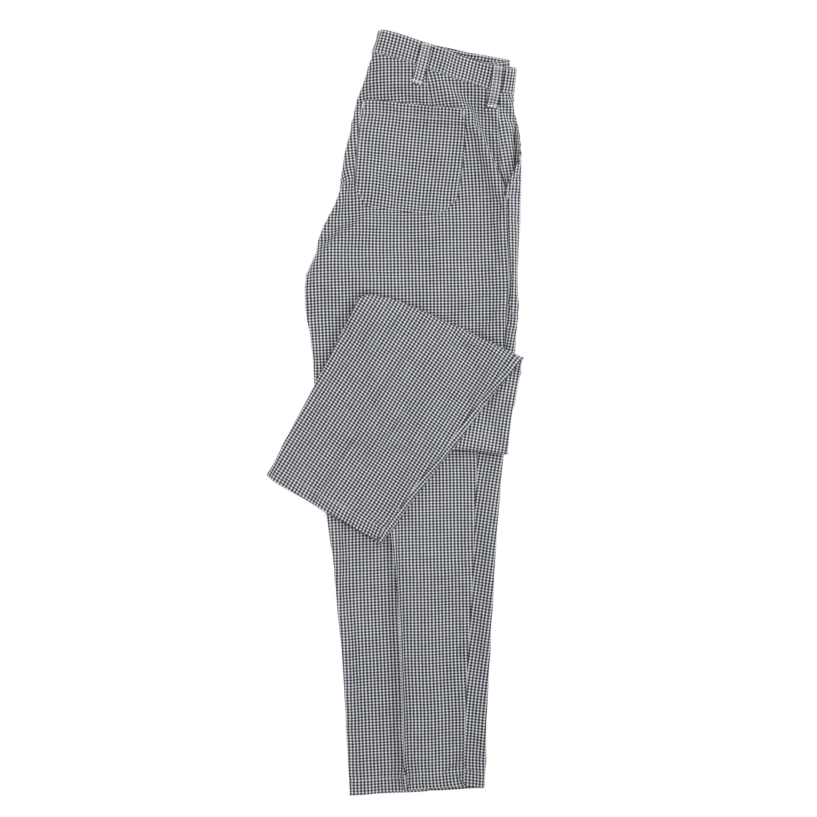 Модель классического прямого кроя, с поясом под ремень. Черные и белые нити ткани образуют ровный гленчек – актуальный всегда и особенно популярный в этом модном сезоне. Стоит отметить высокую марку ткани – специализированной для пошива поварской одежды, качество использованной фурнитуры и безупречную аккуратность выполнения изделия.