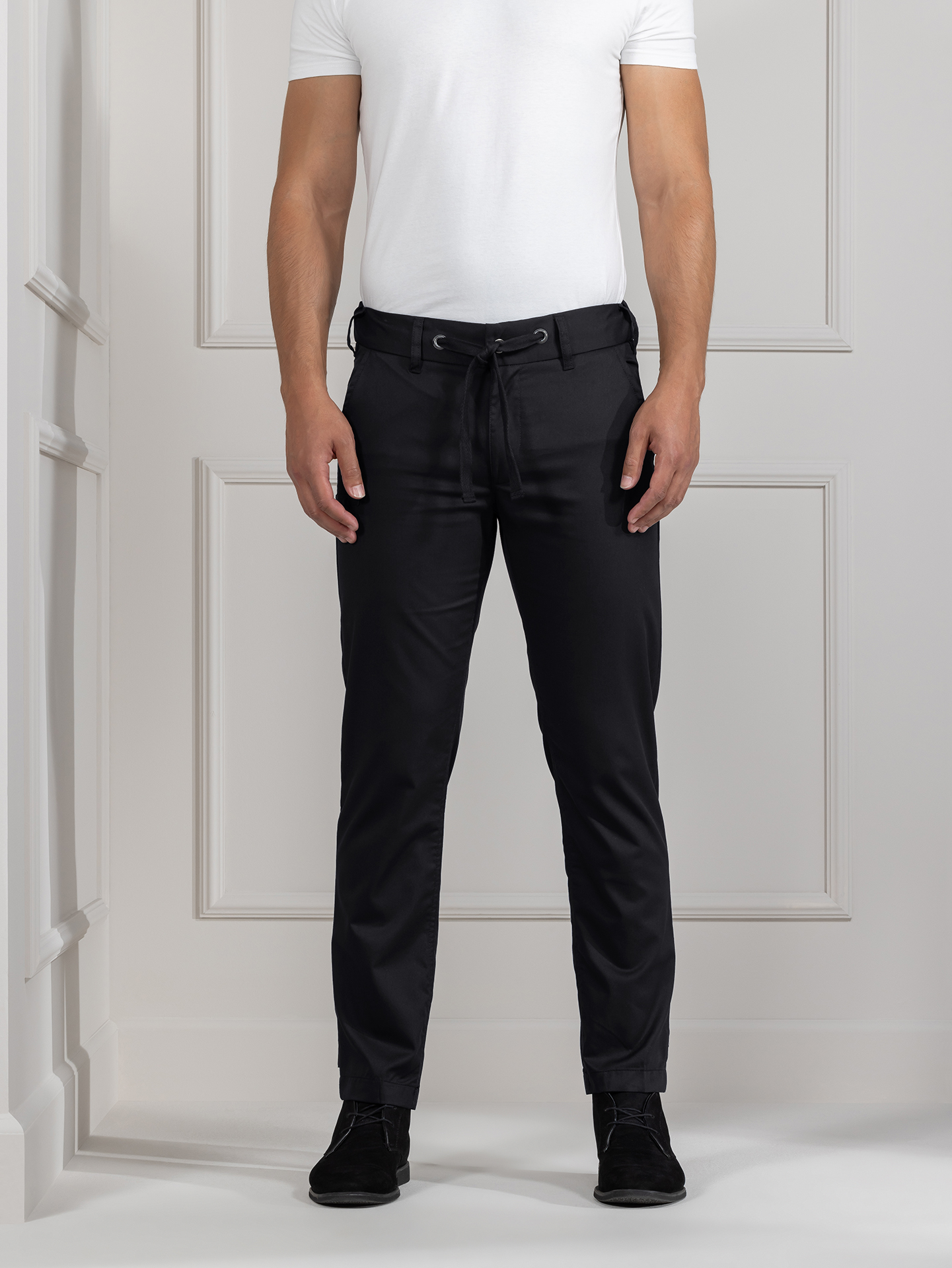 Джинсы Sydney – модель в стиле спорт-кэжуал, которую можно носить в двух вариантах – как чиносы, и как джоггеры. Регулировать обхват манжет брючин можно при помощи паты с двумя пуговицами. Посадка модели стандартная, брючины слегка заужены по всей длине – что соответствует модному кэжуал-тренду. Пояс широкий, с застежкой на молнию и утягивающим шнурком для удобной регуляции обхвата. По сторонам пояса вшита эластичная лента – благодаря этому пояс не соскальзывает при движении. Помимо четырех брючных карманов предусмотрен правый карман-карго и петли для карандаша или инструментов.