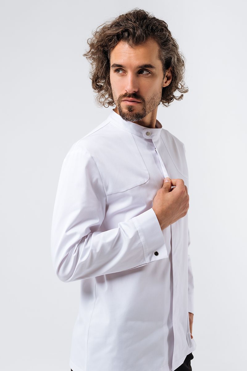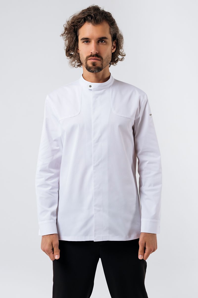 Поварской китель с длинным рукавом и прямым подолом. Свободно сидит в плечах, смотрится мягко и демократично. Манжеты с запонками, декоративные вставки-кокетки и ворот-стоечка создают образ современного и уверенного в себе сотрудника сервиса. Материал представляет собой смесь натурального хлопка и качественного полиэстера с небольшой добавкой лайкры для лучшего вида и формы.