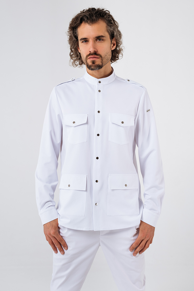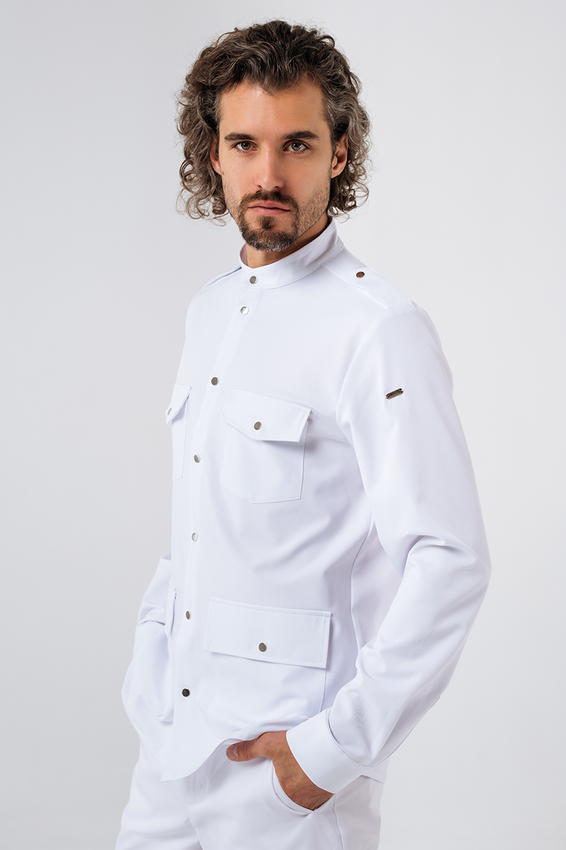Революционный бренд необычной одежды для кухни и сервиса представляет поварской китель. Его стиль пронизан ощущением уверенности и свободы. Мягкая ткань (полиэстер\вискоза с небольшой добавкой лайкры) контрастирует со строгой, практически военной, формой этого жакета. Его особенности – широкий воротник стойка, длинные рукава с плотными манжетами, декоративные погоны на плечах, застёжка на 7 металлических кнопок. Целых 4 накладных кармана (по 2 нагрудных и боковых) позволят разместить всё, что может понадобиться для работы. Кроме того, они прекрасно дополняют мужественный образ, создаваемый этим жакетом.
