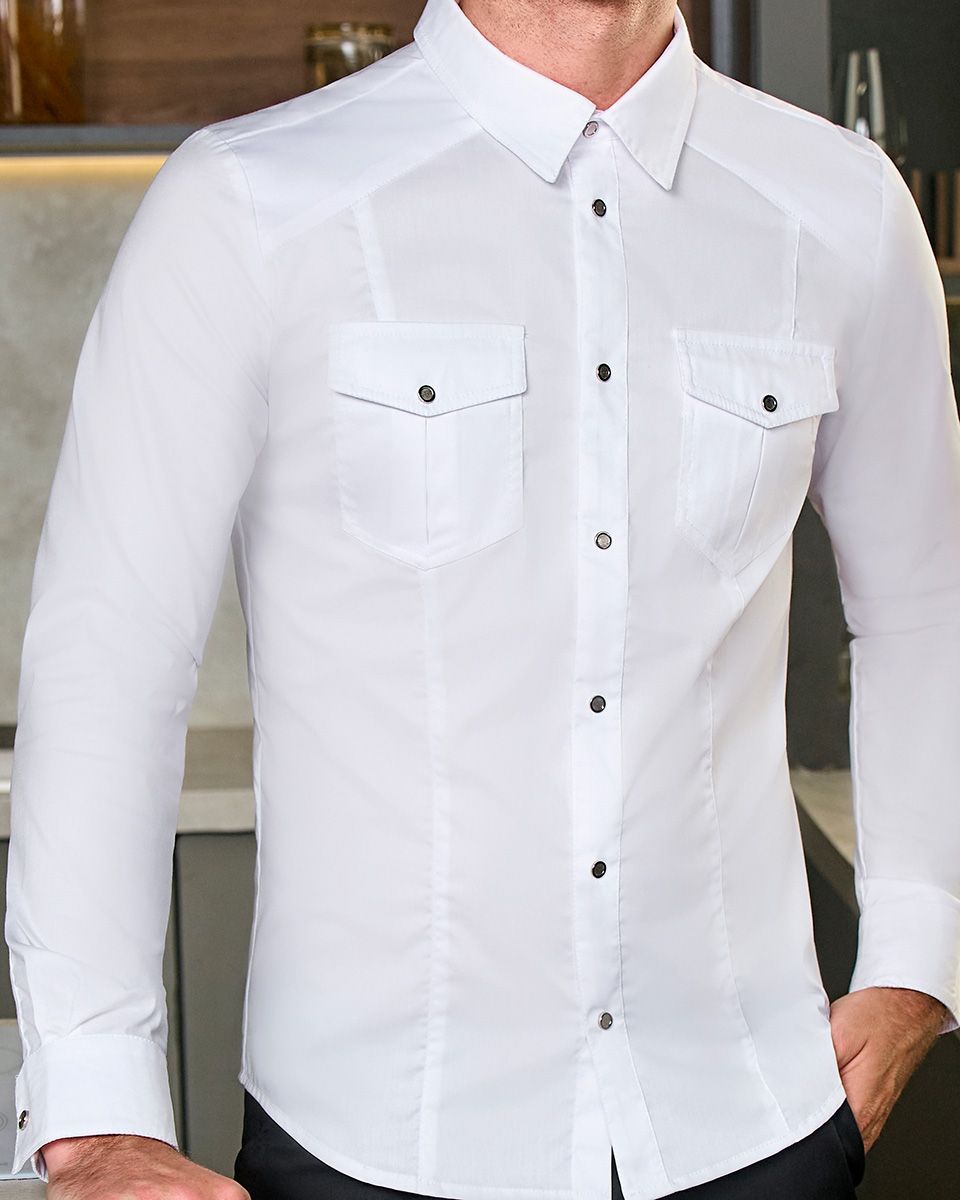 Справа и слева на передней части изделия расположены нагрудные накладные карманы с треугольными клапанами, фиксирующимися на хромированные кнопки. Для удобства хранения небольших мелочей, треугольный низ кармана имеет небольшой защип, а для прочности и эстетичного вида и кармашки и клапаны оформлены двойной строчкой. На спинке под воротничком вшита пата для фиксации фартука. Рукава втачные, полной длины, на манжете фиксируются кнопкой.