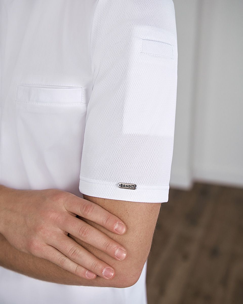 Короткий втачной рукав –идеальное решение для интенсивной работы на профессиональной кухне. Прорезной нагрудный карман и карман на левом рукаве идеально подойдут для необходимых инструментов, которыми пользуется повар – ручка, небольшой блокнот или пинцет.
