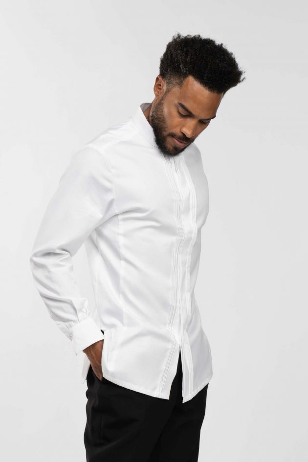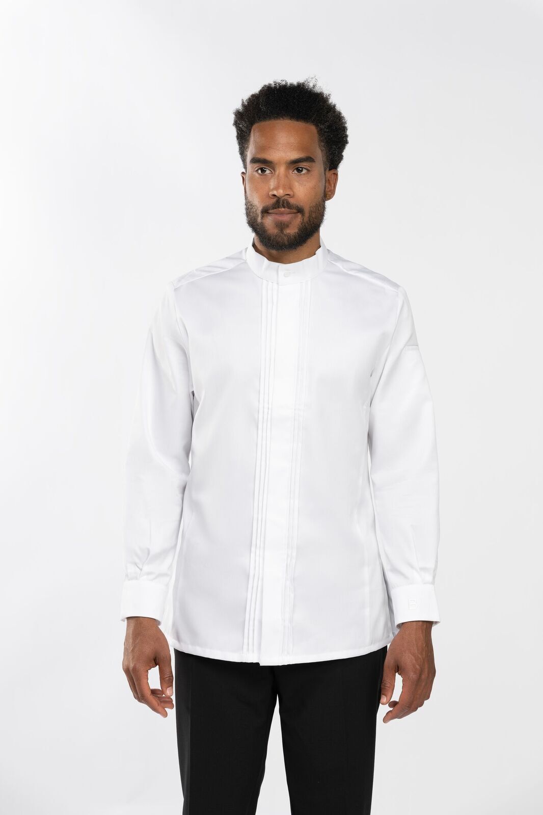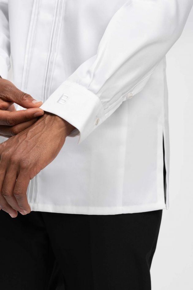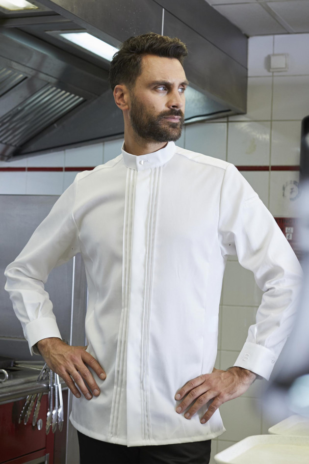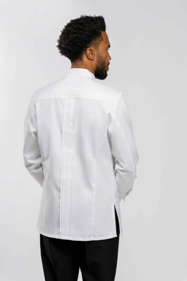 Элегантный поварской жакет, несомненно, достойный ваших лучших кулинарных шедевров! Он целиком пошит из натурального хлопка лучших сортов. Строгий офицерский ворот и манжеты застёгиваются на пуговицы с перламутровым отливом. Прочие элементы застёжки скрыты под планкой. По обеим сторонам от планки и сзади вдоль спинки заложены складки-плиссе. На левом рукаве расположен кармашек для термометра, а манжет с той же стороны украшен вышитой буквой "B" - логотипом бренда.