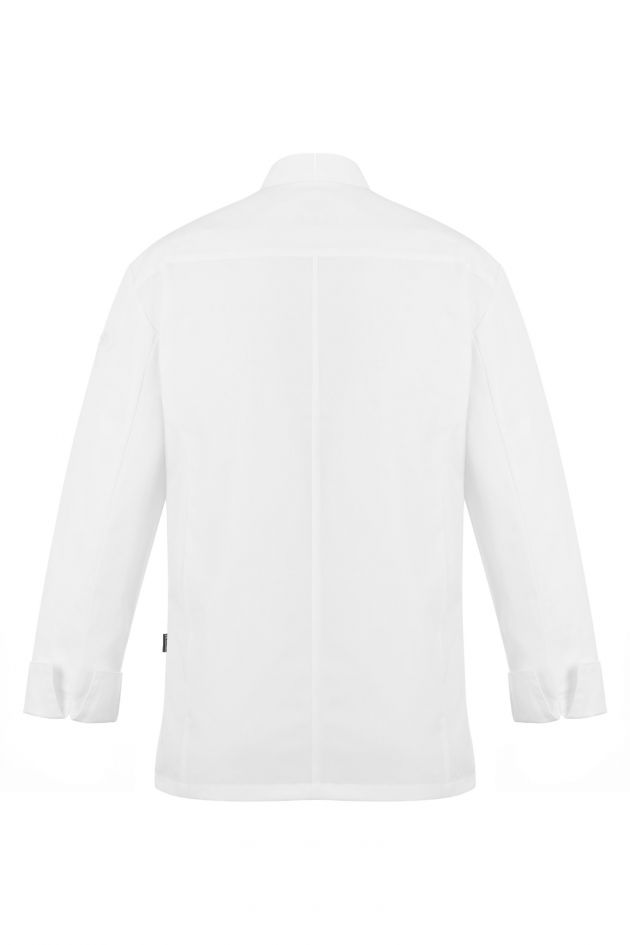 Стильный однобортный жакет прямого силуэта с классическим воротом фасона "мандарин" и длинным рукавом. Застёжка на металлических кнопках, большей частью скрыта под планкой. Подмышками есть вентиляционные отверстия - они обеспечивают приток воздуха даже в самые жаркие рабочие часы. Манжеты образуют строгие отвороты. На левом рукаве расположен карман для термометра. Борт отделан тонким контрастным кантом.