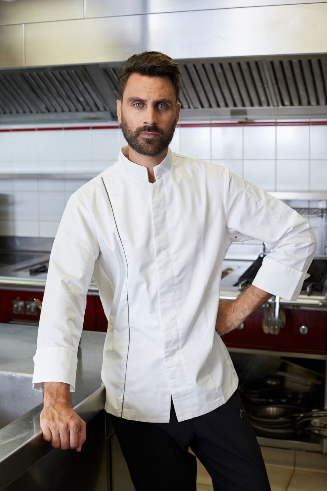 Свободный поварской жакет прямого силуэта с воротом-стойкой и длинным рукавом. Легко гладится, требует минимального ухода. Внутренняя сторона воротника подшита мягкой махровой тканью. На спинке заложена удобная бантовая складка. Потайная застёжка на 6 пуговиц расположена спереди. Карман для ручки на левом рукаве. С правой стороны - тёмно-серая линия, характерная для униформы су-шефа.