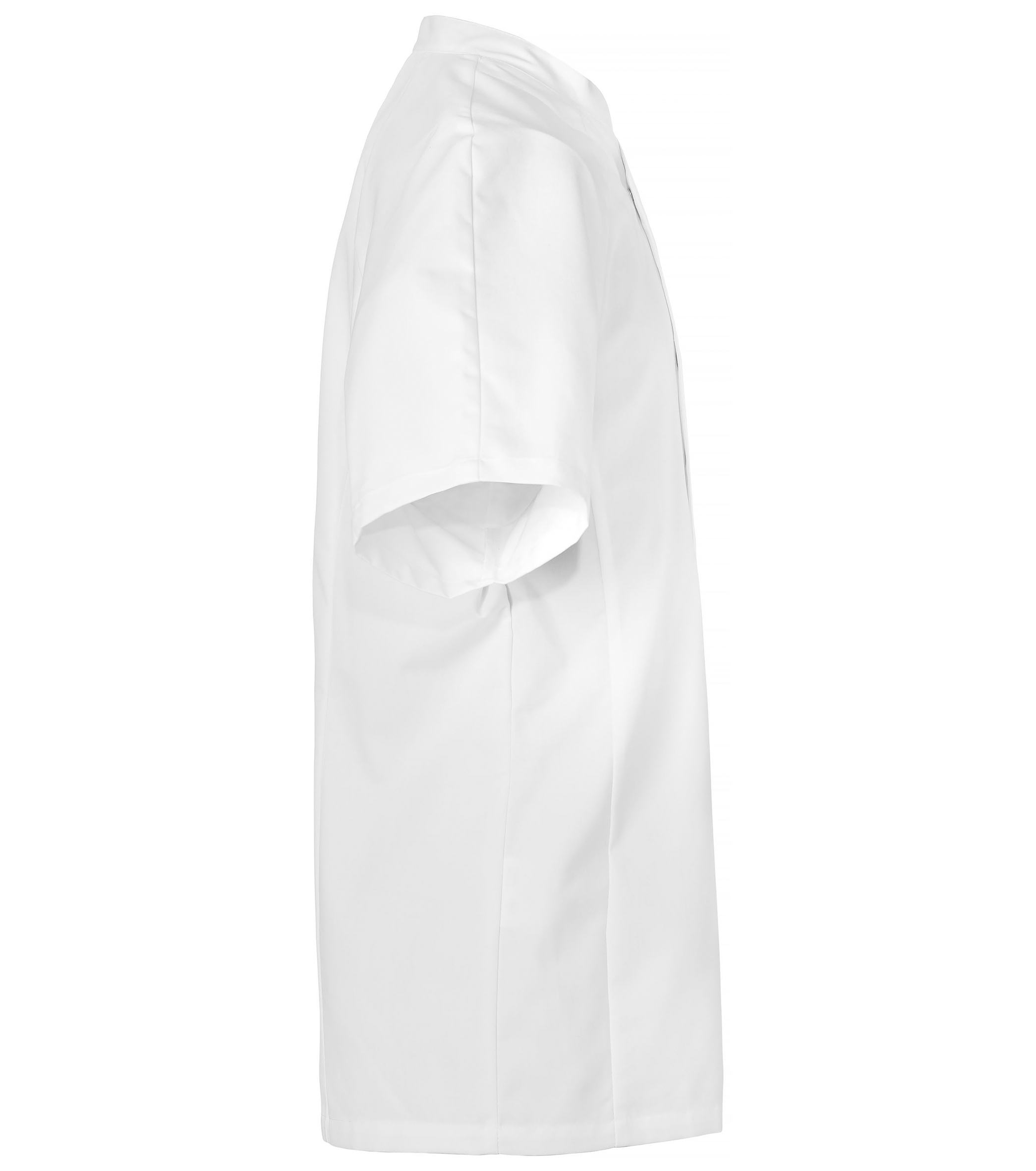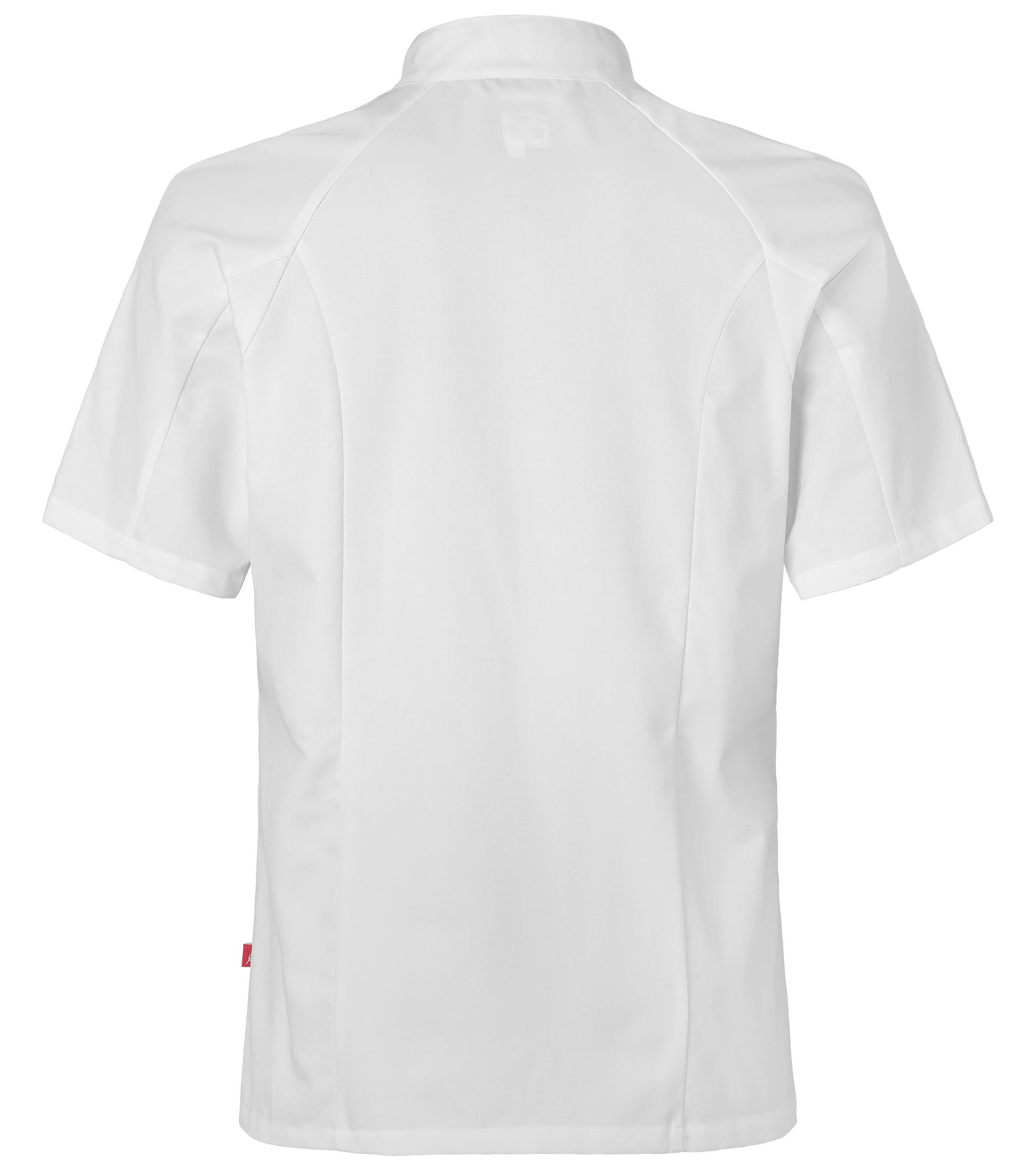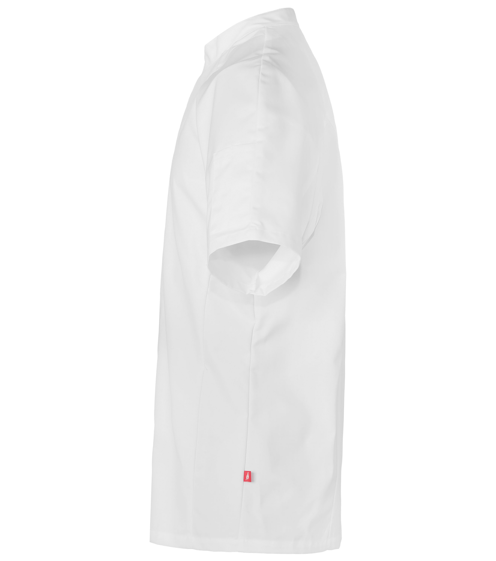 Двубортный поварской китель с коротким рукавом. Модель построена по современным лекалам. Её характеризуют такие особенности как: вертикальные швы на спинке, подчёркивающие силуэт, свободный рукав-реглан и привычный для поварской униформы жёсткий воротничок-стойка. Подол прямой. Жакет застёгивается на потайные кнопки. На обратной стороне ворота есть воздушная петля усиленная нейлоновой нитью. Там же расположена ярко-красная нашивка с логотипом бренда. На левом плече - двойной кармашек для письменных принадлежностей.