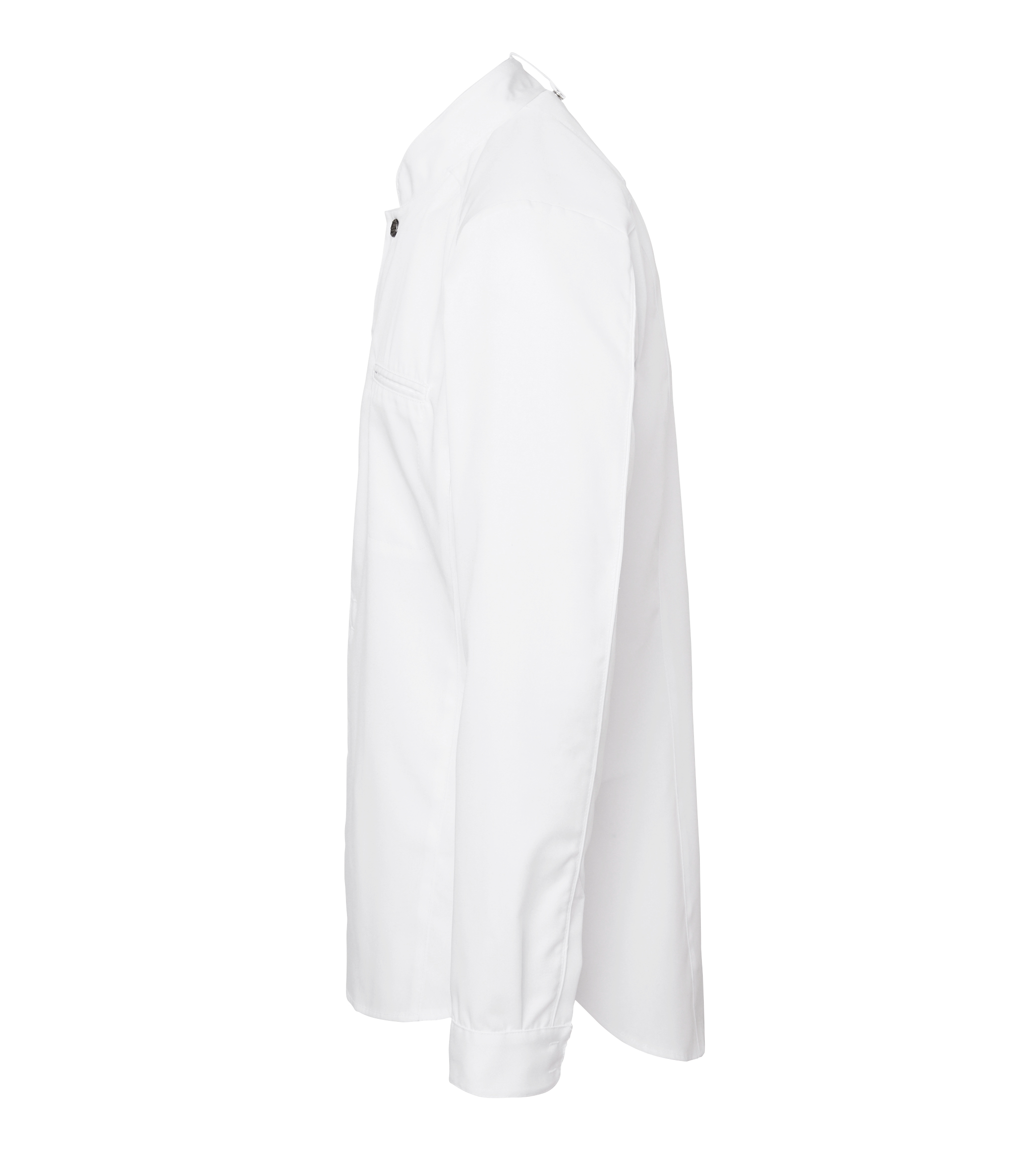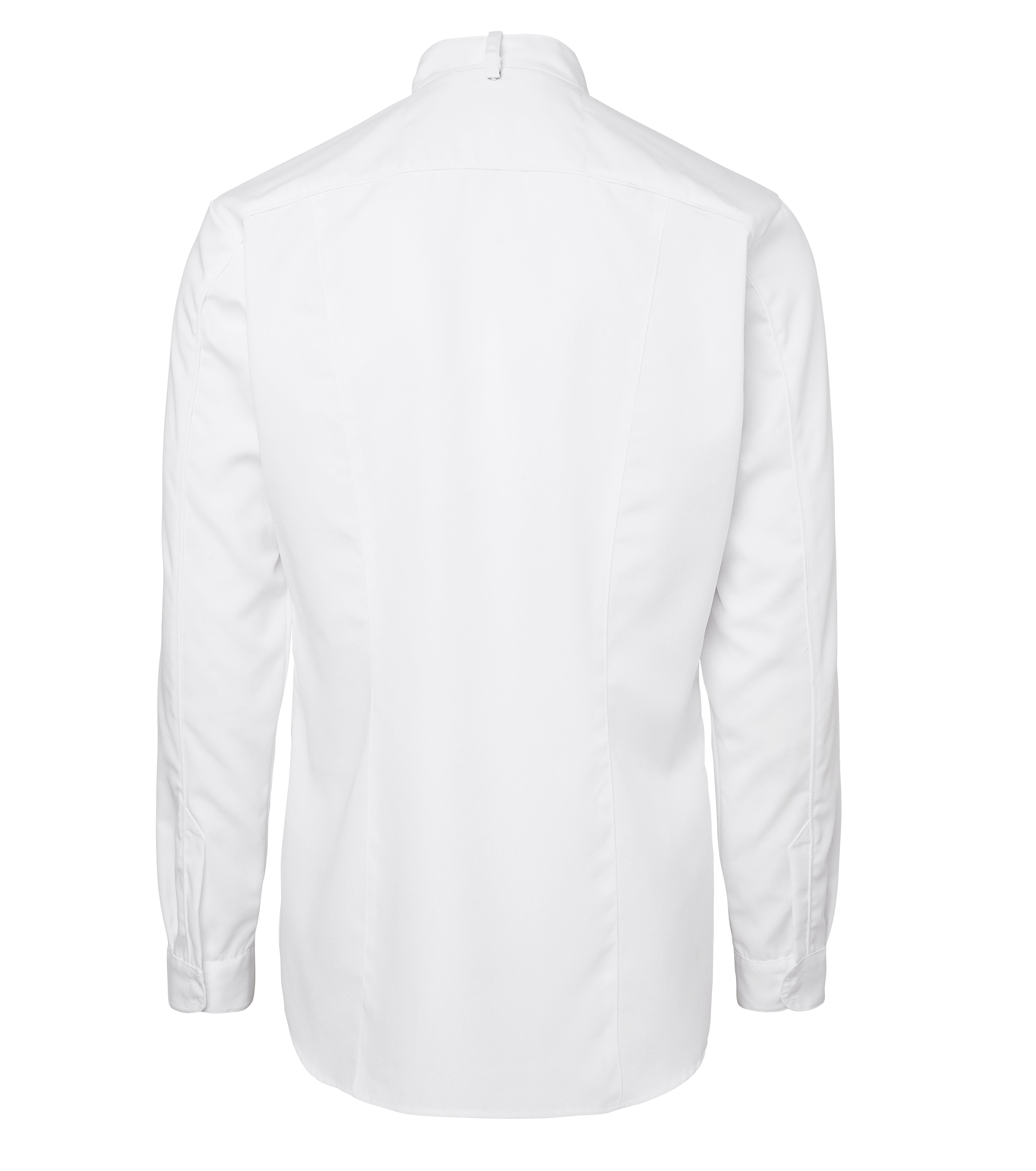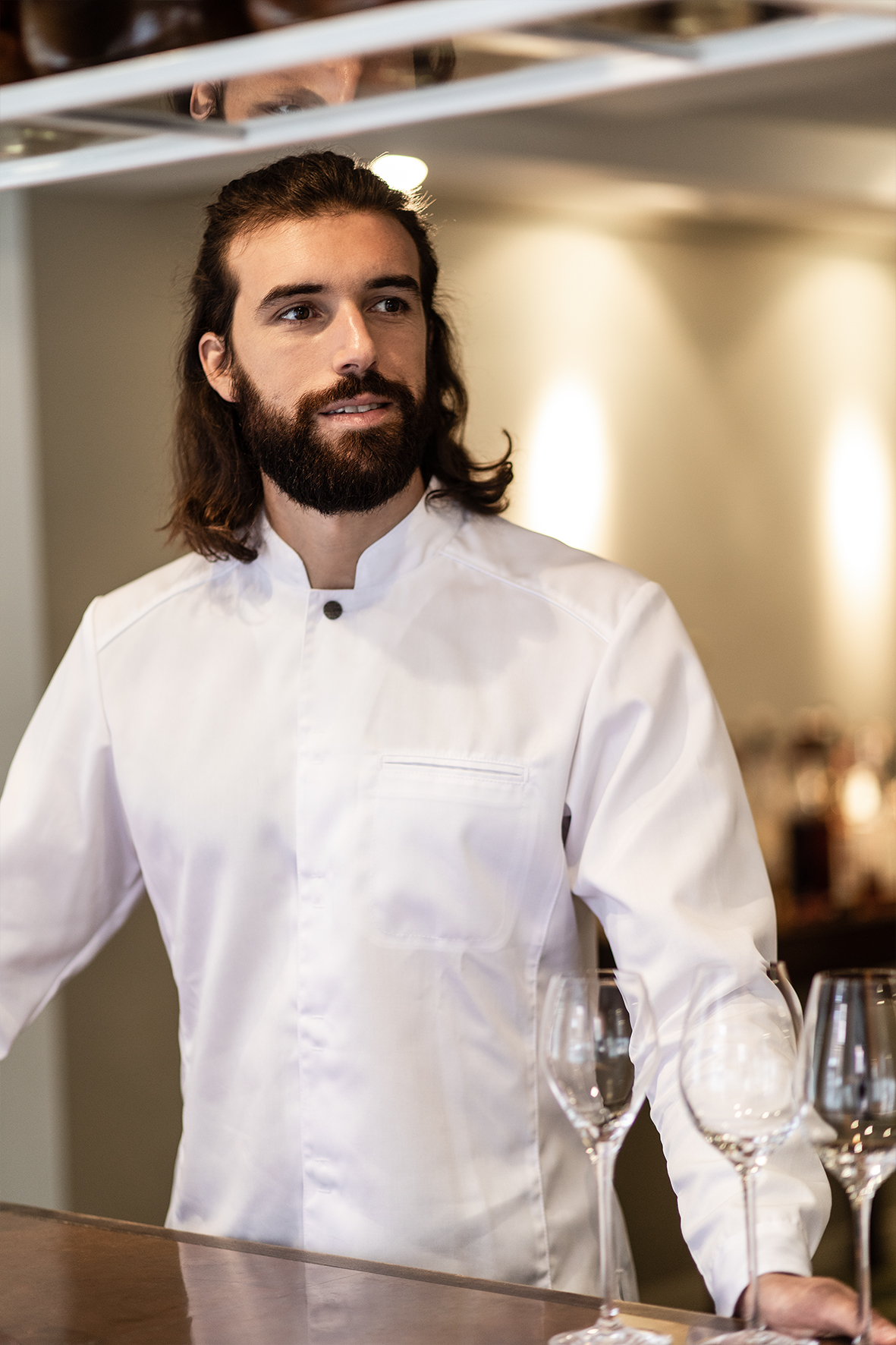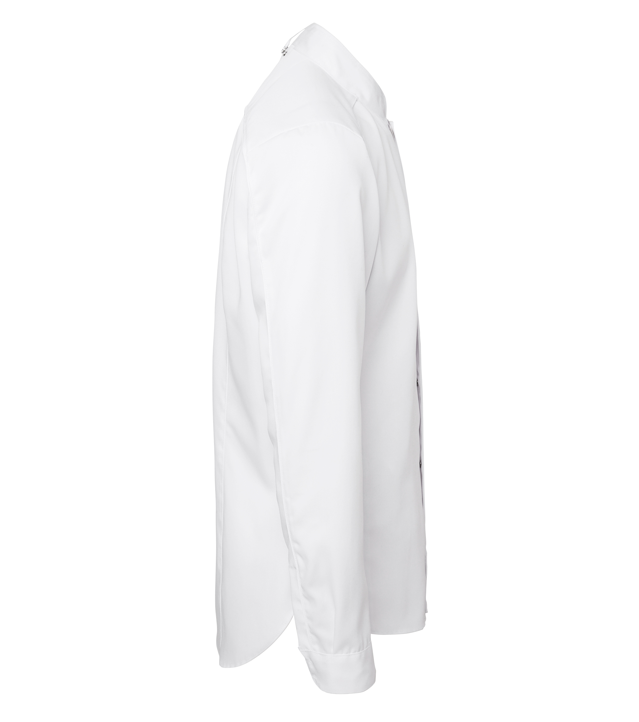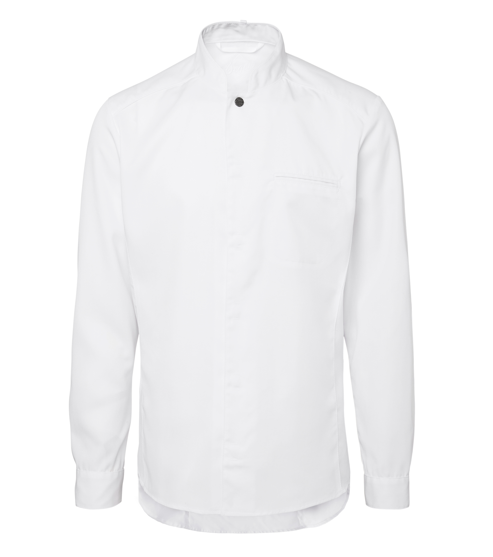 Форменный китель шеф-повара в современном классическом стиле. Стройный силуэт. Потайная застёжка на кнопках. Верхняя кнопочка чёрного цвета, видна на вороте. Перед стиркой её рекомендуется снять. Нагрудный карман с левой стороны. Длинные рукава. Рубашечные манжеты с разрезами, застёгиваются на скрытые кнопки. Кокетка, продольные швы. Асимметричный подол с закруглёнными углами и удлинённой спинкой. На внешней стороне ворота есть пата для шейного ремешка фартука. С изнанки – воздушная петлица. В швы ворота, рукавов и кокетки вставлен кант в тон изделия.