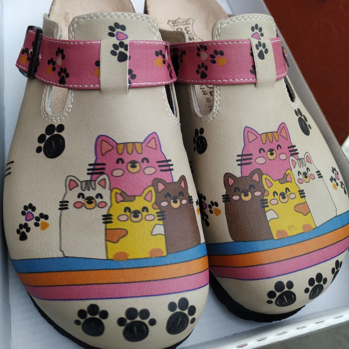 Замечательный тематический рисунок – котики и отпечатки их лапок – подойдет любому, кто любит котиков. Розовый оттенок, яркий, но немаркий, выигрышно смотрится на кухне. Немаловажно, что сабо ShoeRokee имеют анатомическую стельку, которая позаботится о здоровье стопы в течение всей смены.