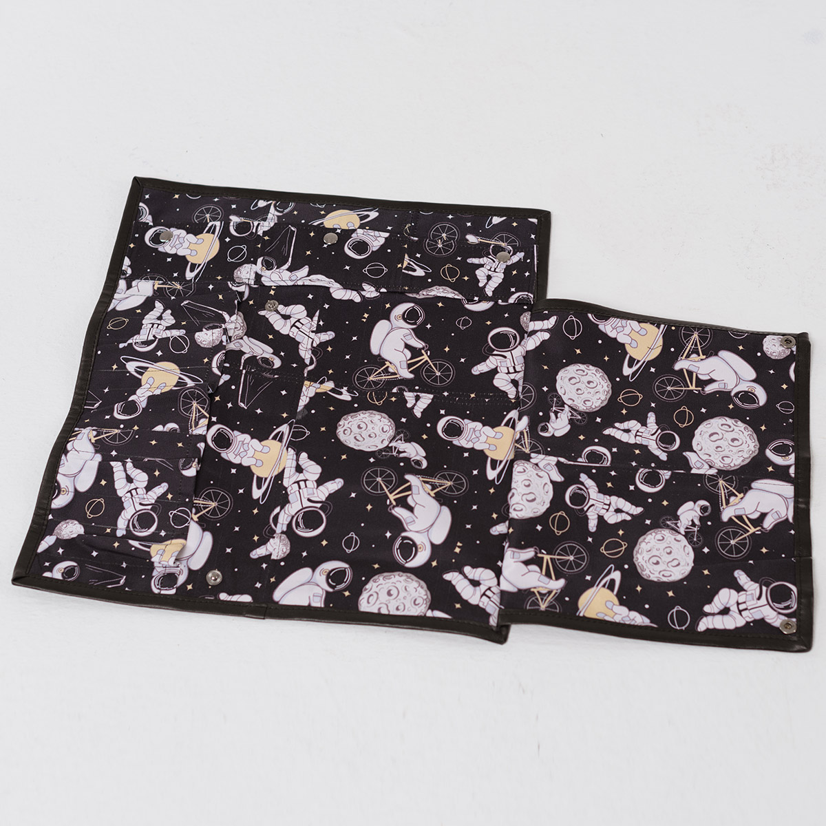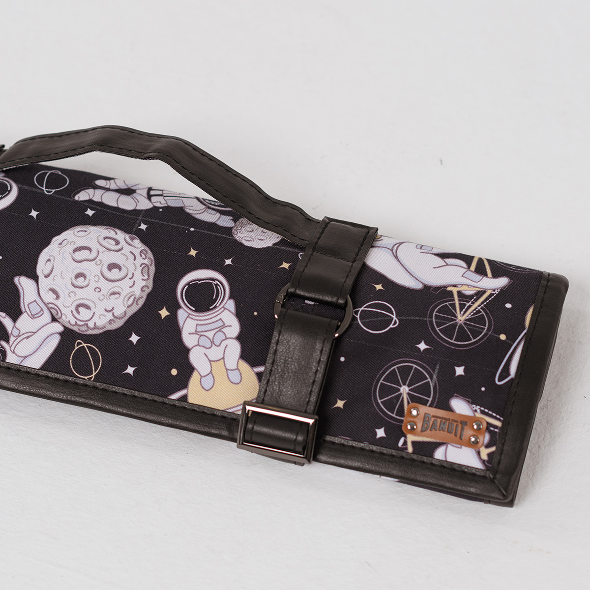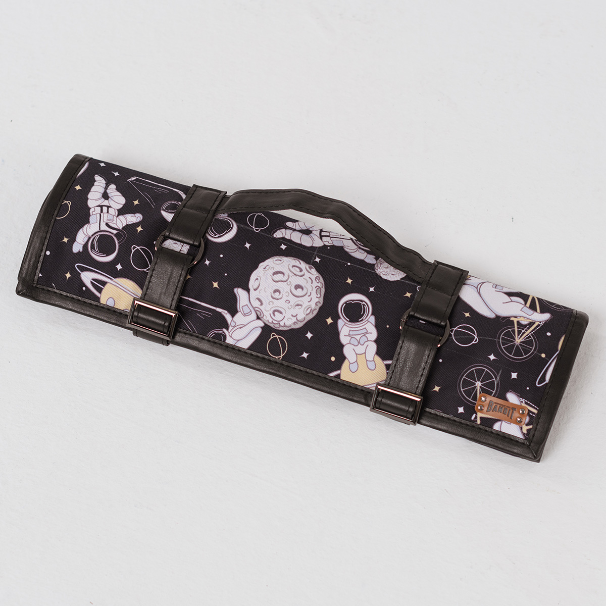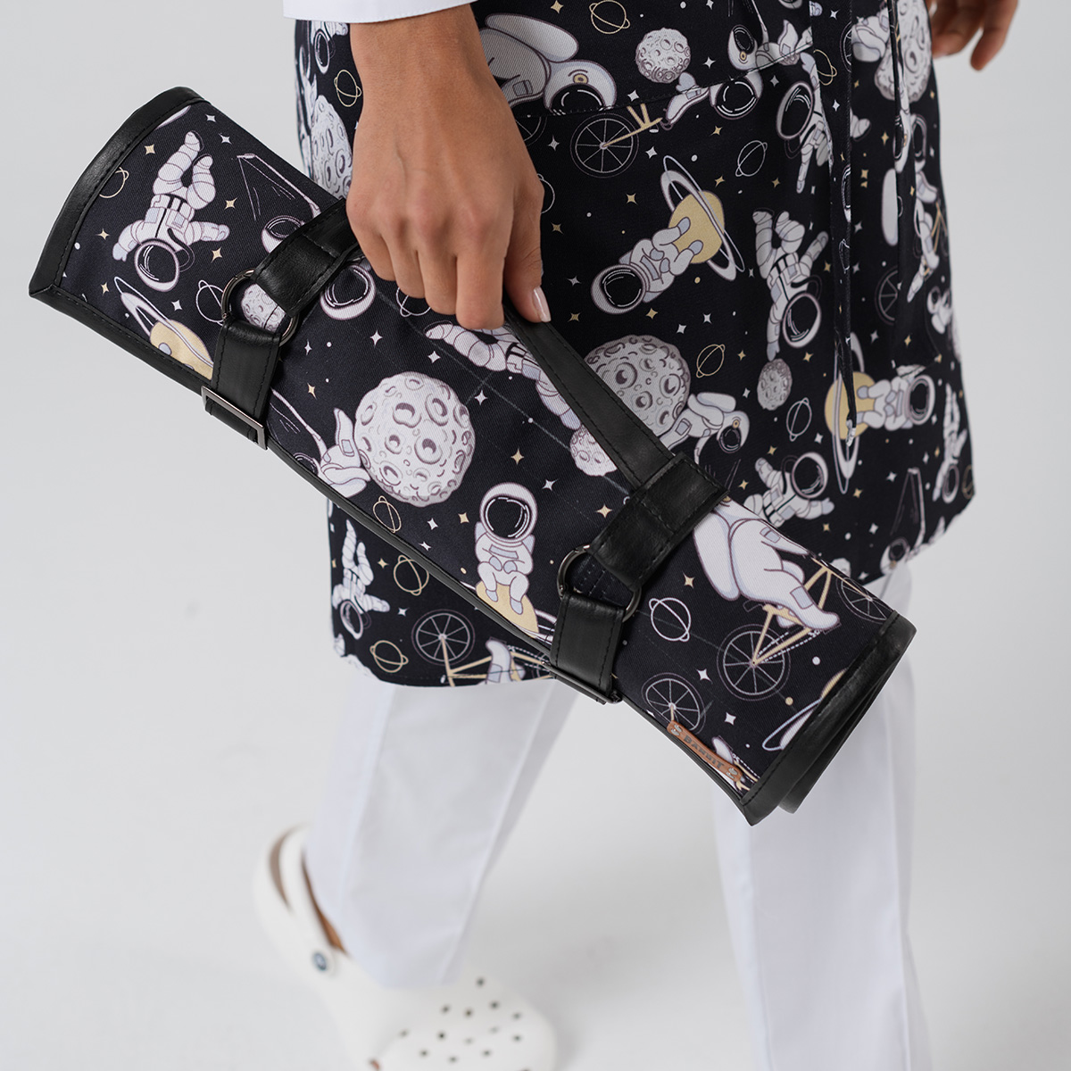 Скрутка для ножей от ультрамодной марки BANDIT - это неоценимая помощь в работе шеф-повара. Удобные отделения позволят носить с собой весь свой арсенал, а натуральный хлопок с небольшим добавлением спандекса лучше всего предохранит сталь от сырости. Ремешки и отделка внешних сторон выполнена из экокожи, мягкой и прочной. Отличительная особенность этой серии — оригинальные принты, подчёркивающие ваш неповторимый стиль.