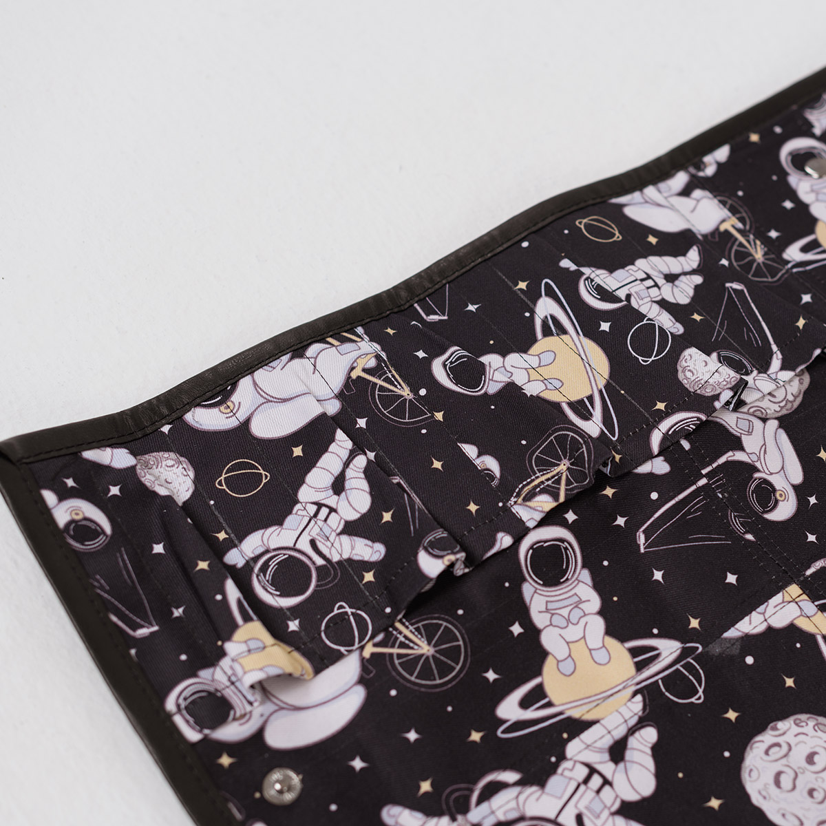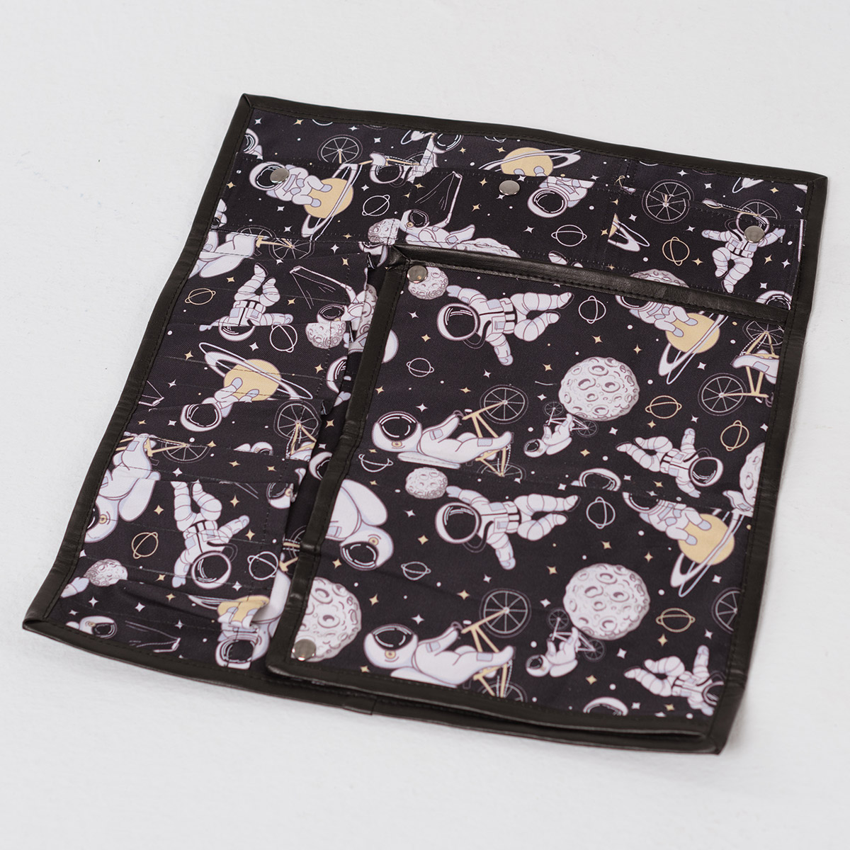 Пять объемных карманов под ножи, шесть плоских – для пинцетов, карман с клапаном, застегивающийся на три кнопки размером 45*12 см, защитный клапан, застегивающийся на кнопки. В свернутом виде скрутку фиксируют два карабина – кольца. Длина ремней регулируется в зависимости от наполнения скрутки. Есть ручки для переноса.