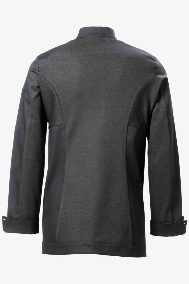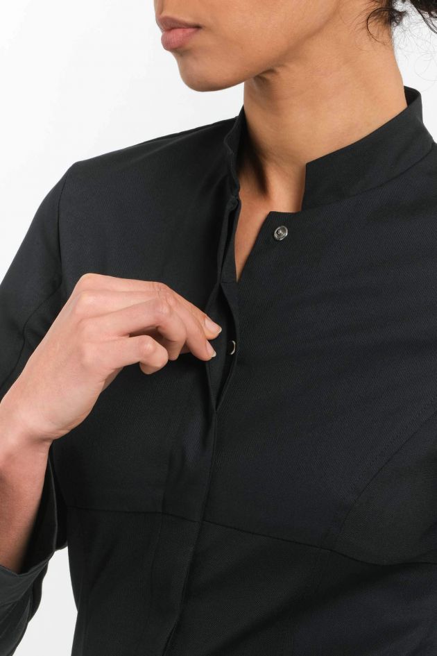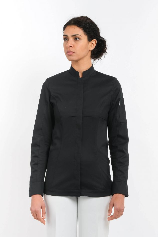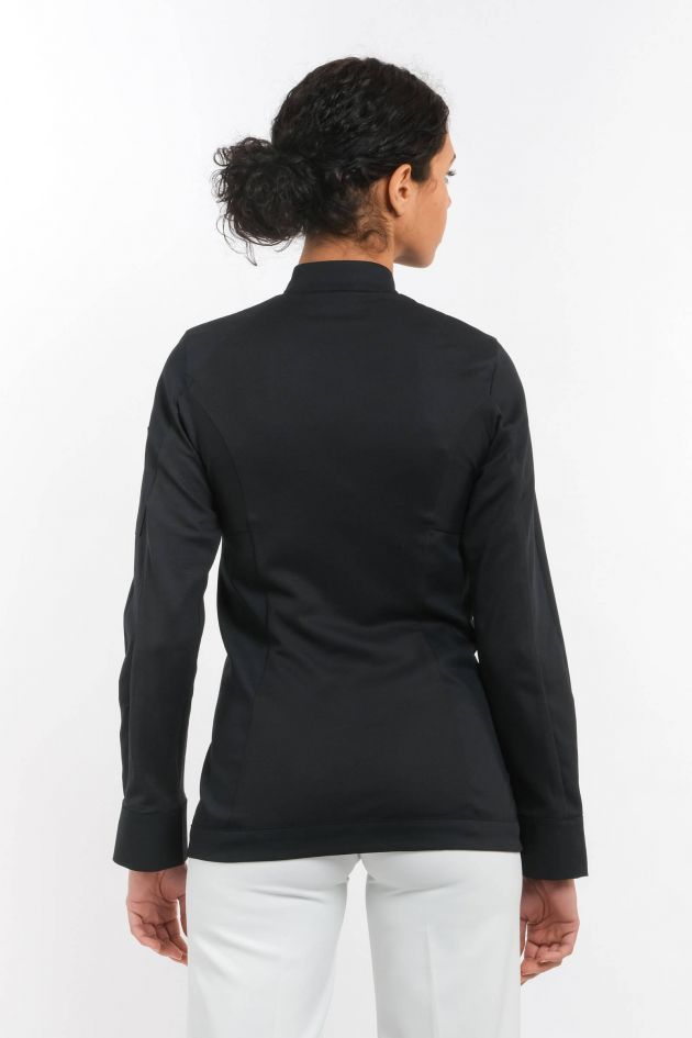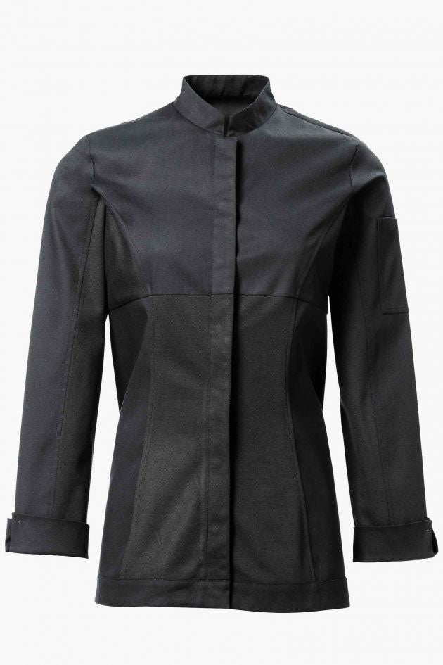 Дамский однобортный жакет приталенного кроя. Оригинальность этой модели - в сочетании традиционных элементов поварской униформы с комфортом спортивной одежды. Ворот-стойка и широкие фигурные манжеты дополняются симметричными вставками из двустороннего трикотажа. Внешняя сторона вставки полиэстровая, а внутренняя - из чёсаного хлопка: такой состав обеспечивает ткани эффективную терморегуляцию и максимальный комфорт. Элегантно оформлена потайная застёжка (кнопочки скрыты под планкой). На левом рукаве расположен карман для авторучки.