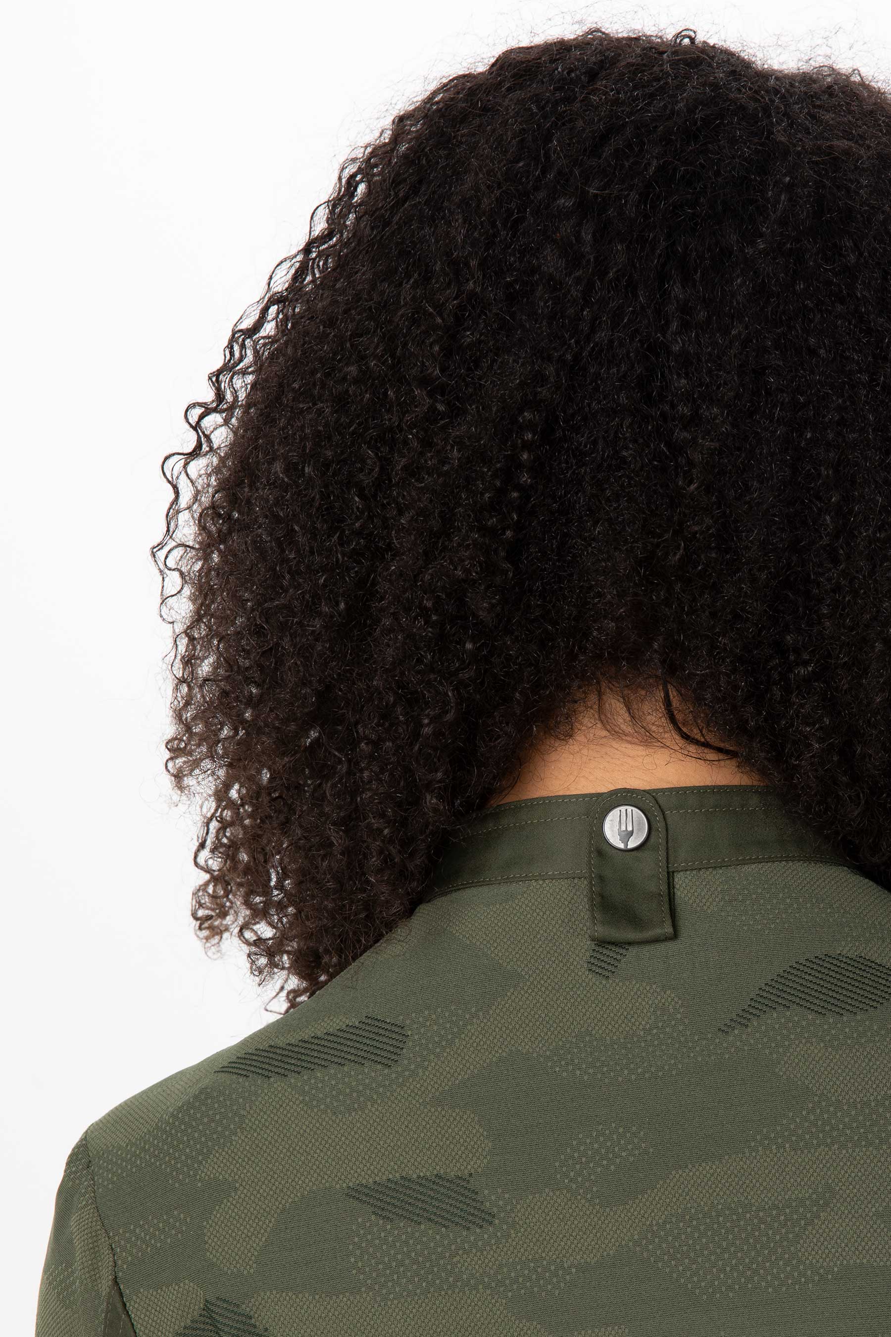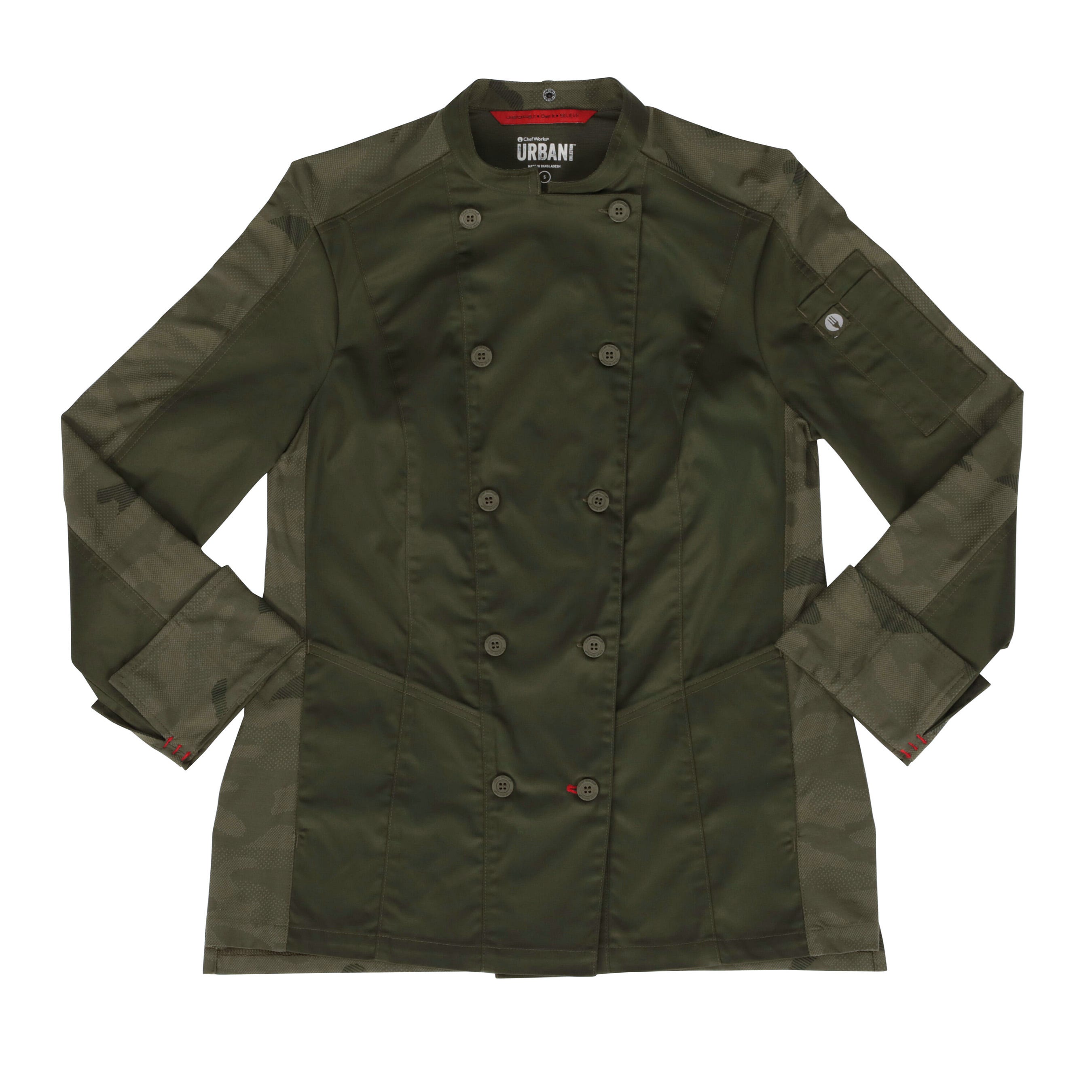 У этой модели длинные рукава, ворот-стойка и стильная камуфляжная расцветка. С зади под воротником - пата для фиксации бретелей фартука. Спинка и внешняя сторона рукавов выполнена из эластичного трикотажа Cool Vent™, а вертикальные разрезы в боковых швах создают дополнительный приток воздуха. Застёгивается китель спереди на фирменные пуговицы, изготовленные из полупрозрачного, но очень прочного пластика. На левом рукаве расположен кармашек для термометра с четырьмя отделениями и нашивка с логотипом компании.