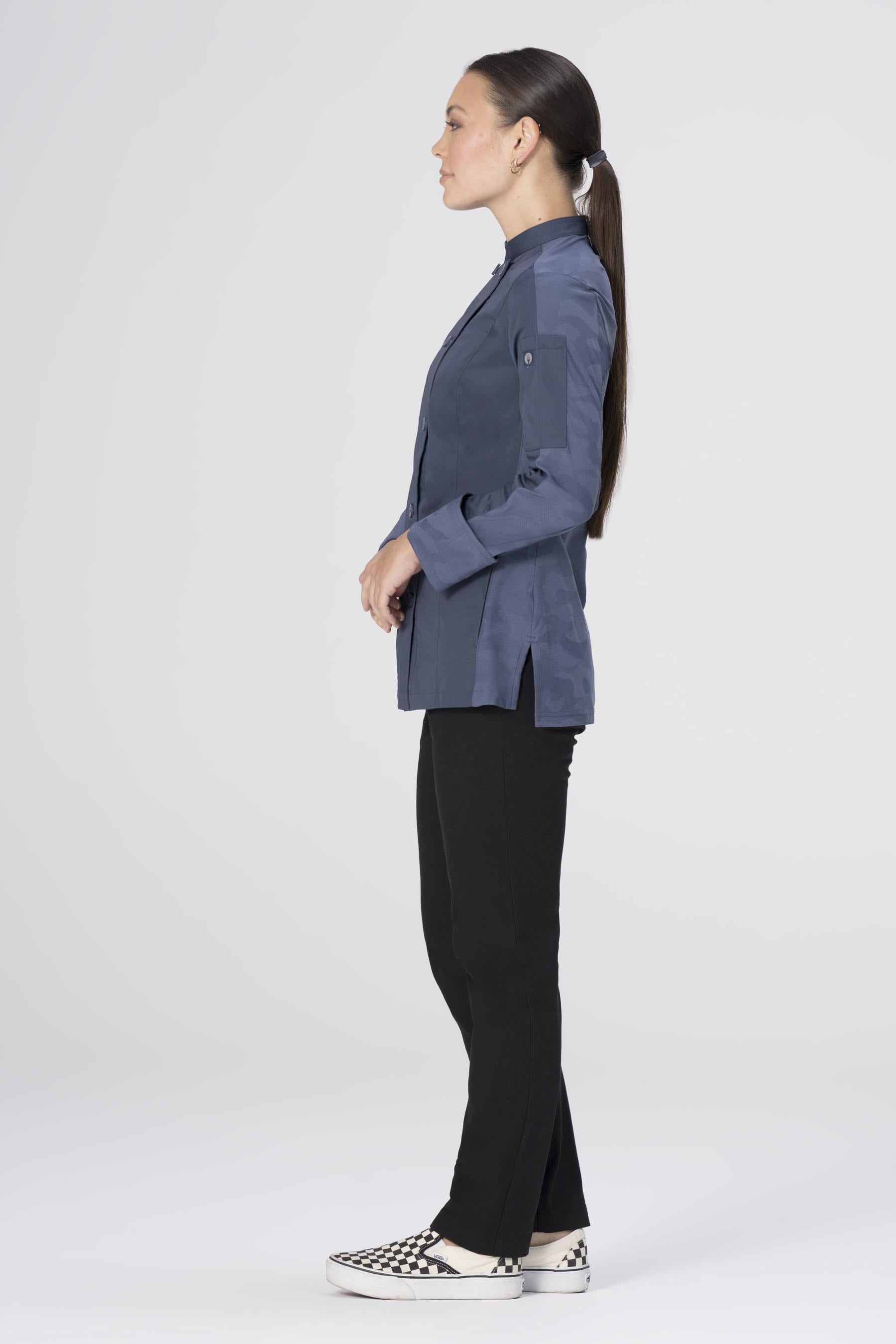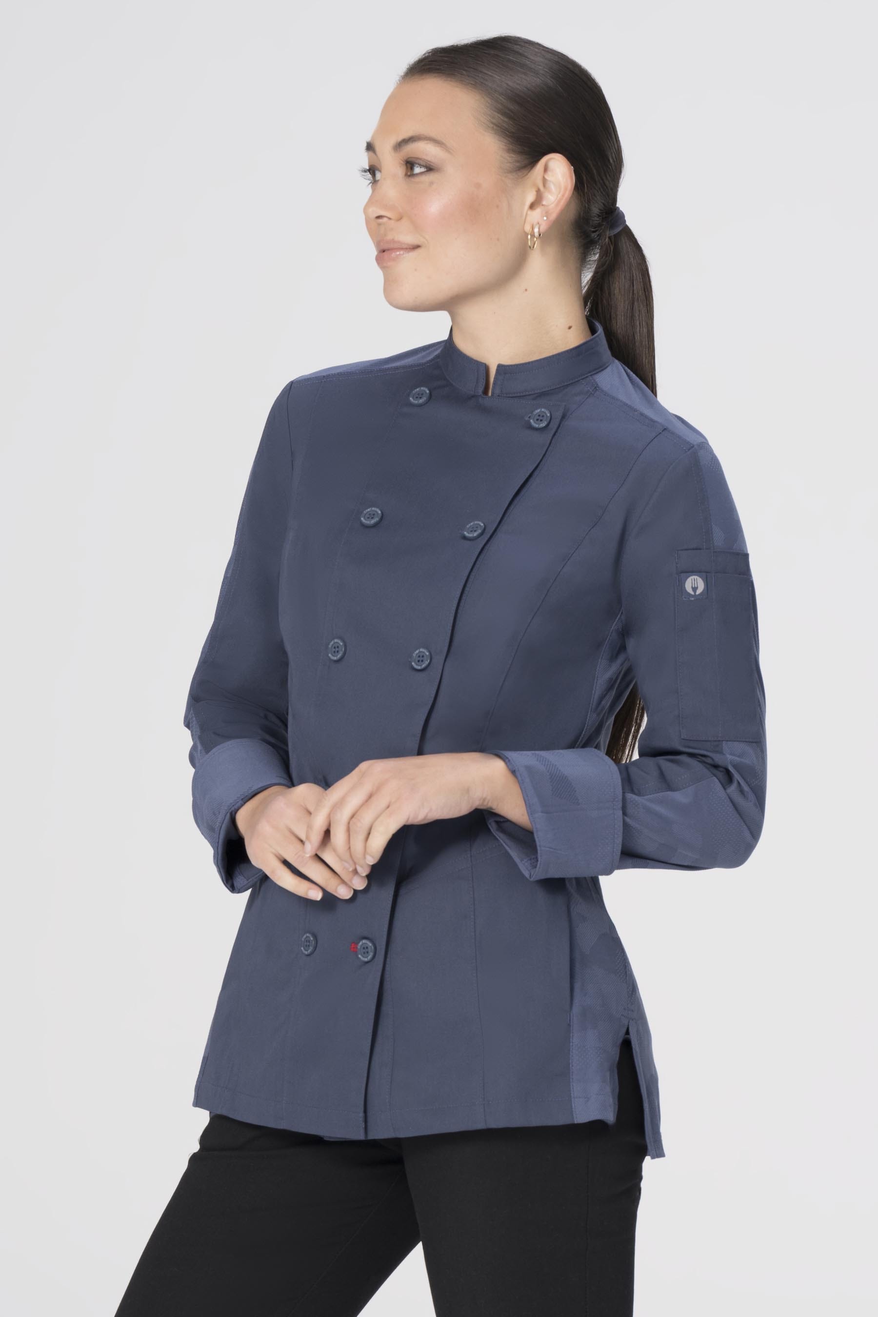 У этой модели длинные рукава, ворот-стойка и стильная камуфляжная расцветка. С зади под воротником - пата для фиксации бретелей фартука. Спинка и внешняя сторона рукавов выполнена из эластичного трикотажа Cool Vent™, а вертикальные разрезы в боковых швах создают дополнительный приток воздуха. Застёгивается китель спереди на фирменные пуговицы, изготовленные из полупрозрачного, но очень прочного пластика. На левом рукаве расположен кармашек для термометра с четырьмя отделениями и нашивка с логотипом компании.